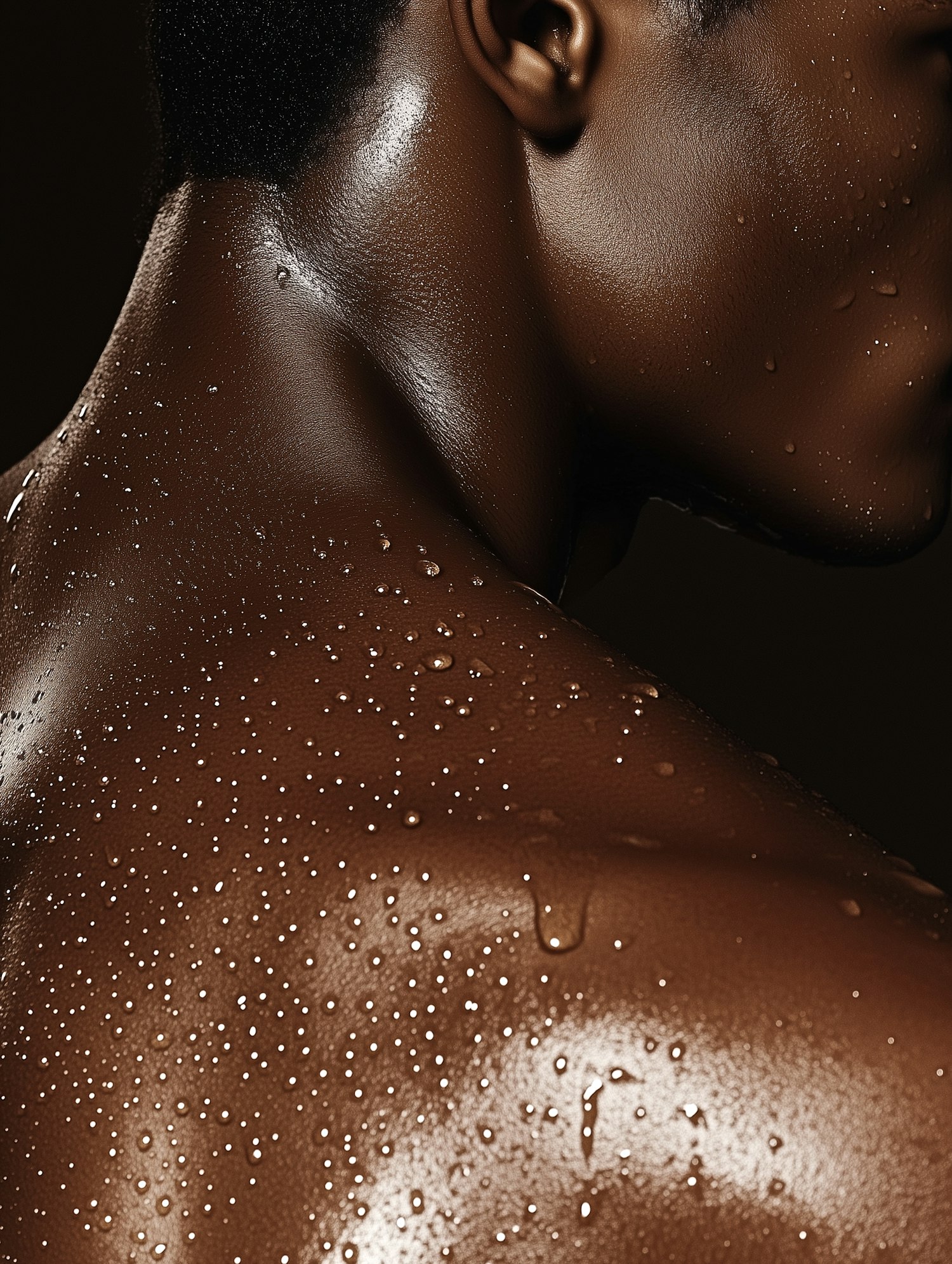 Close-up of glistening dark brown skin with water droplets, highlighting smooth texture and contours against a dark background.