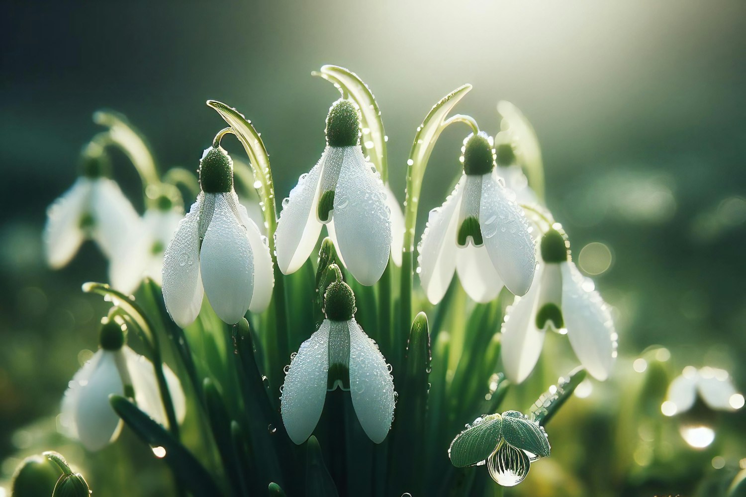 Close-up of snowdrop flowers with dew, capturing their delicate white petals and green stems in soft morning light.