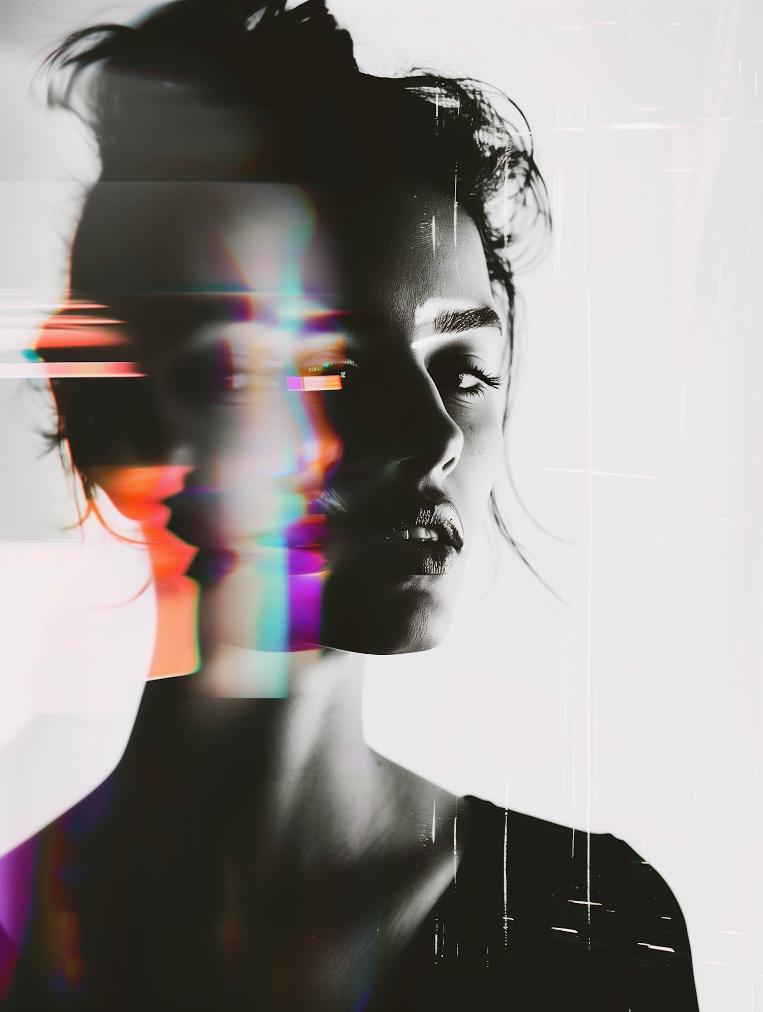 Black-and-white portrait with glitch effect overlay, featuring a woman with intense gaze and vibrant digital distortions.