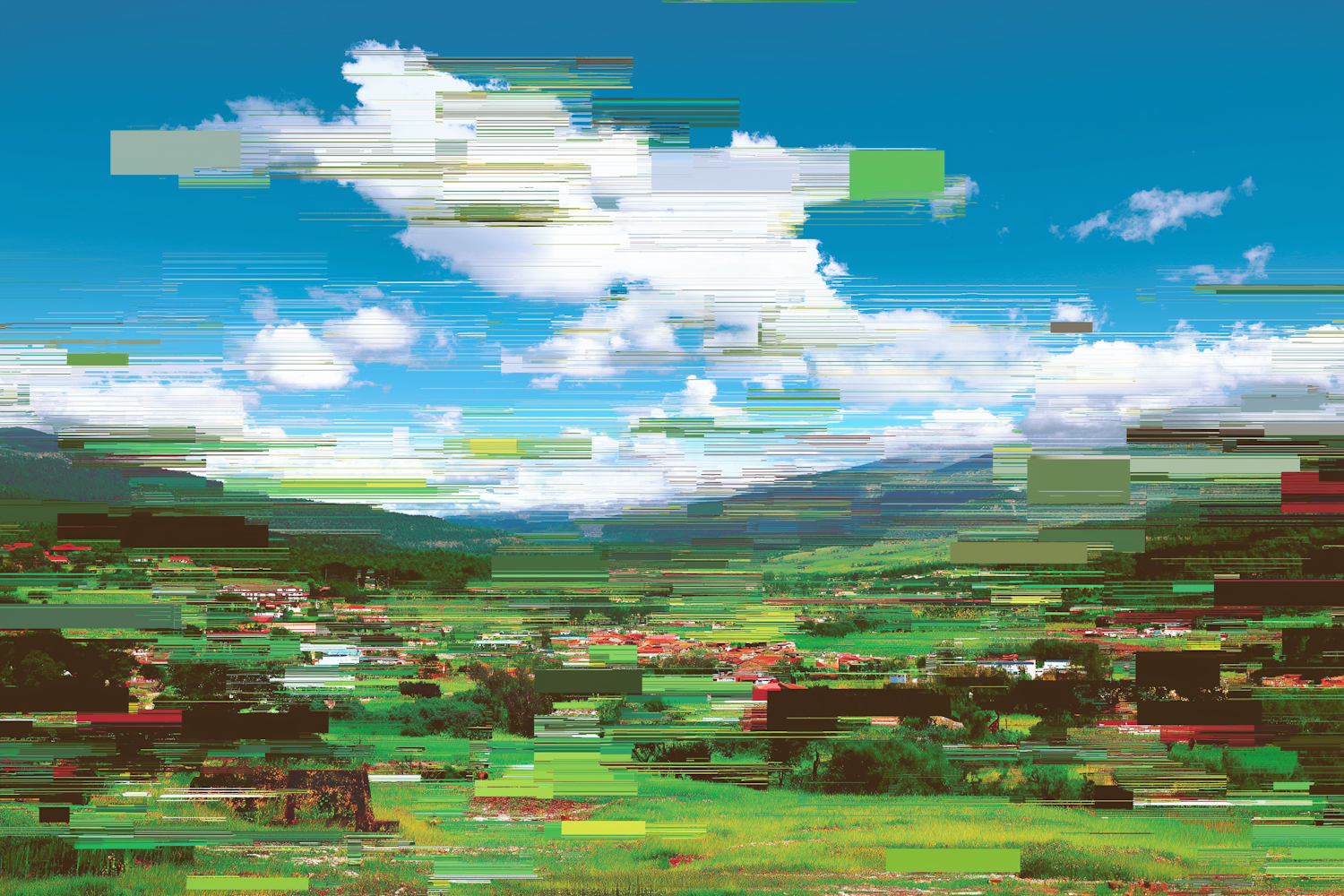 Glitch pixel background landscape with green fields, red-roofed buildings, and a blue sky with clouds.