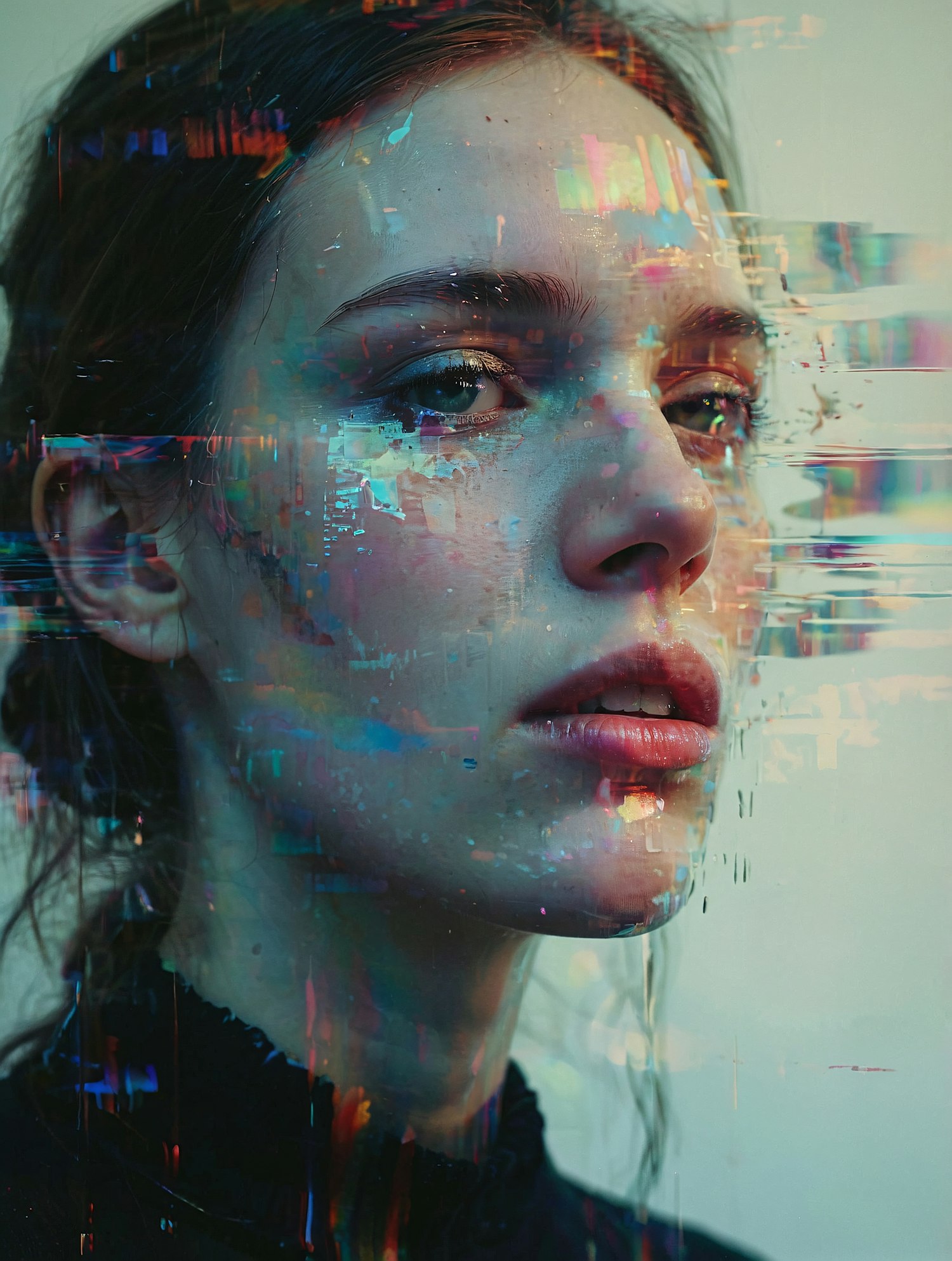 Close-up of a young woman with glitch-like digital effects overlaying her face, creating a surreal and futuristic aesthetic.