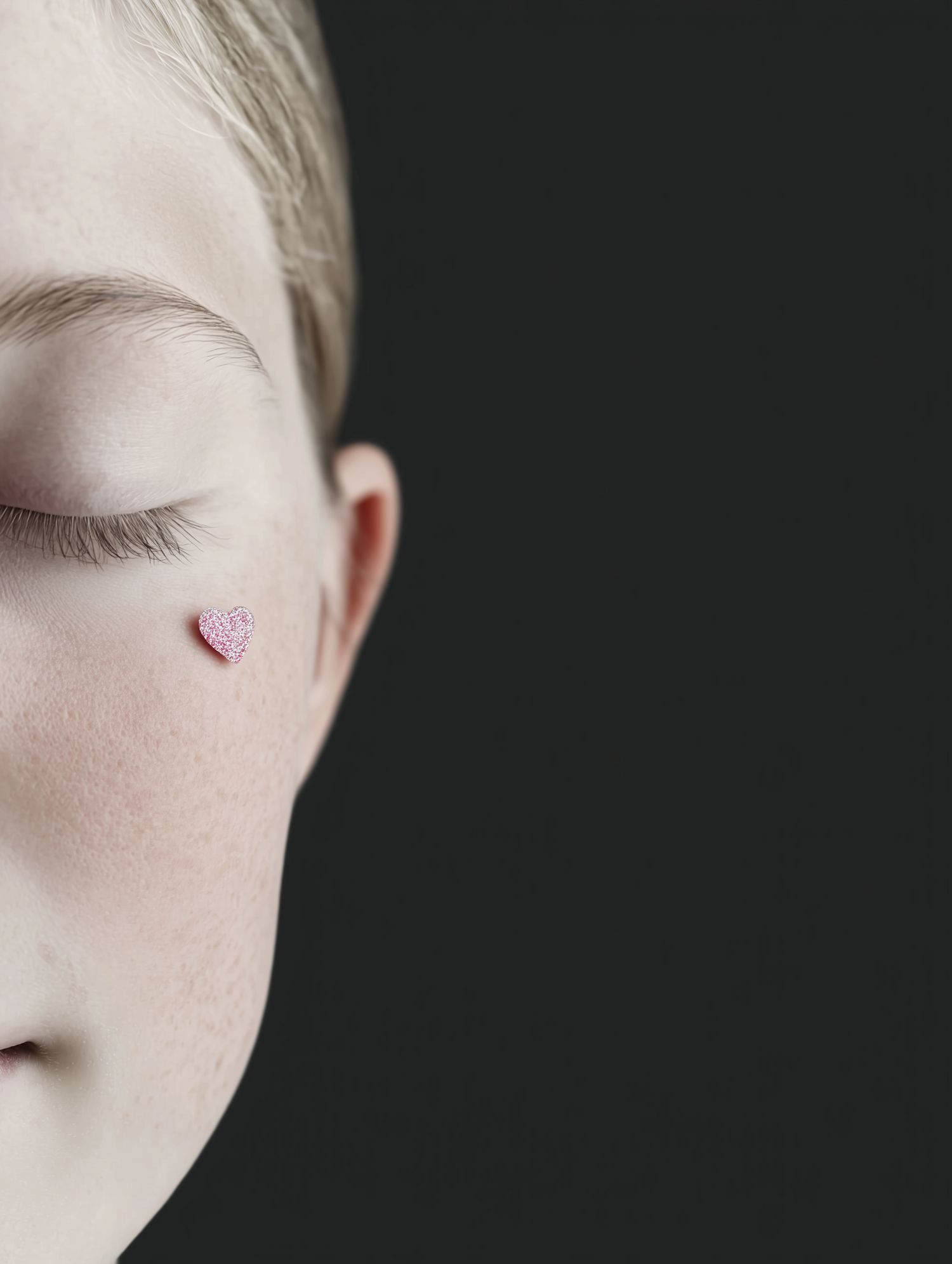 Close-up of a face with a pink glitter heart on the cheek, set against a black background, highlighting the smooth skin and delicate detail.