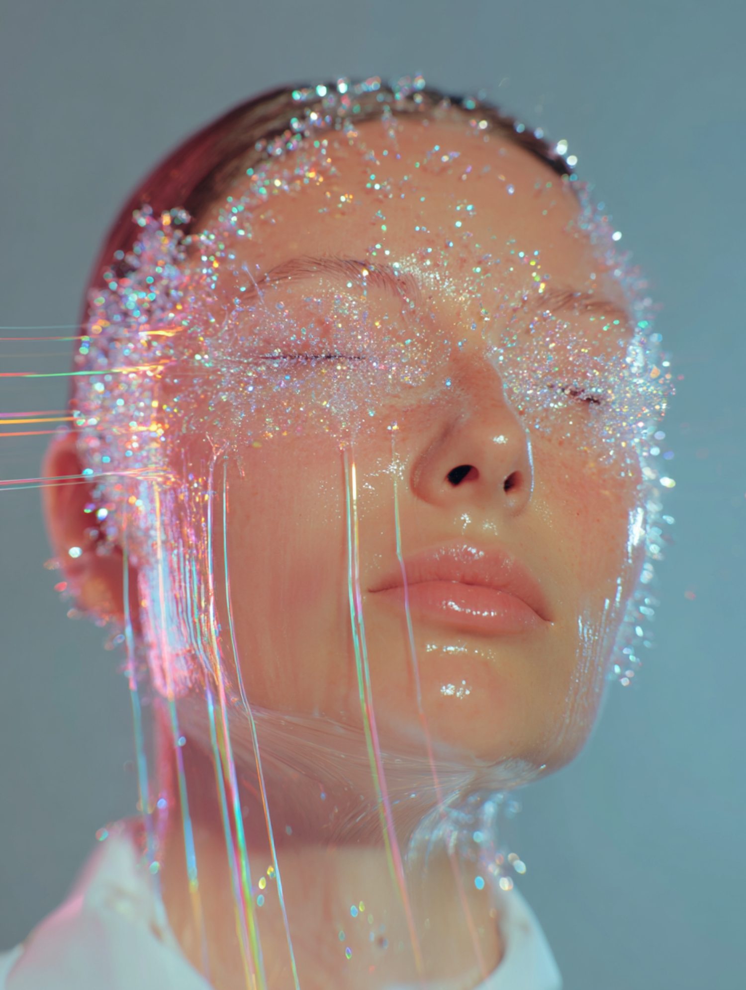 A close-up portrait of a person with glitter and iridescent textures on their face, creating a surreal and artistic visual effect.
