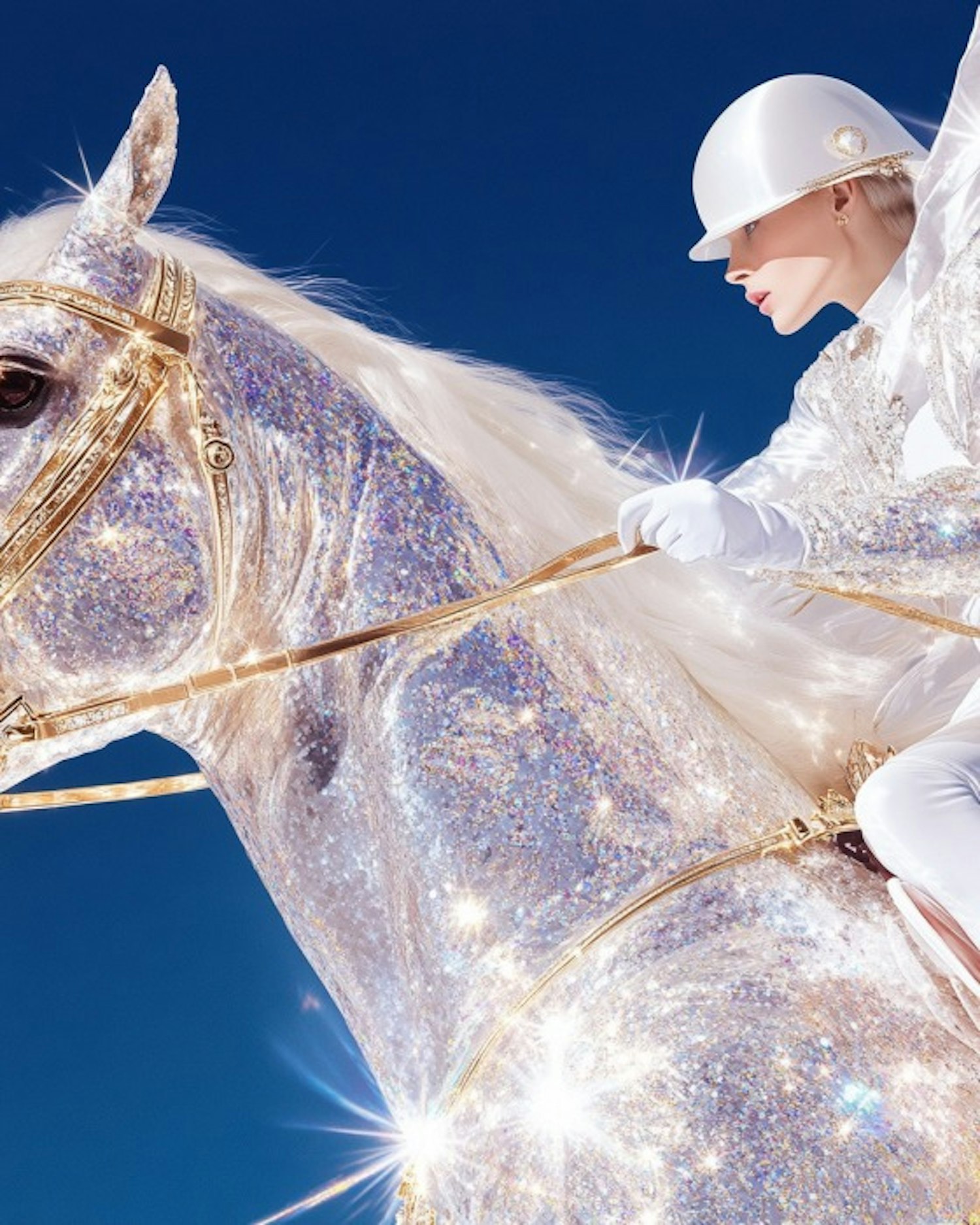 A sparkling horse and rider in glittering attire against a deep blue sky, exuding elegance and fantasy.