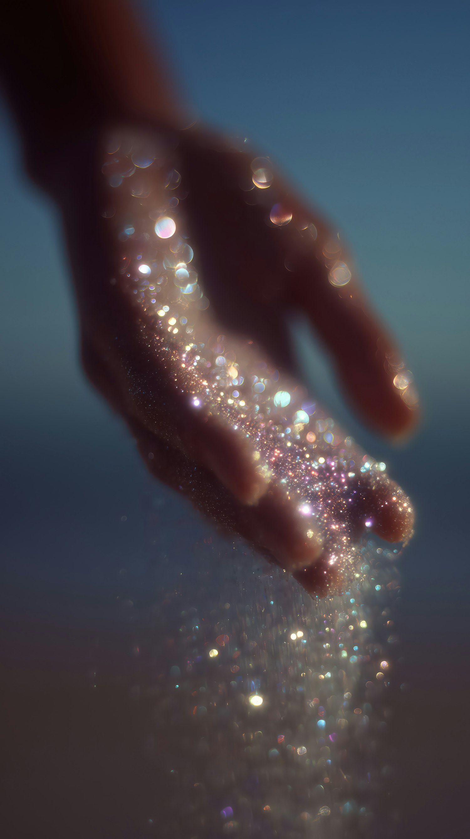 A hand releasing sparkling glitter in soft focus, with a dreamy bokeh effect and a serene blue background.