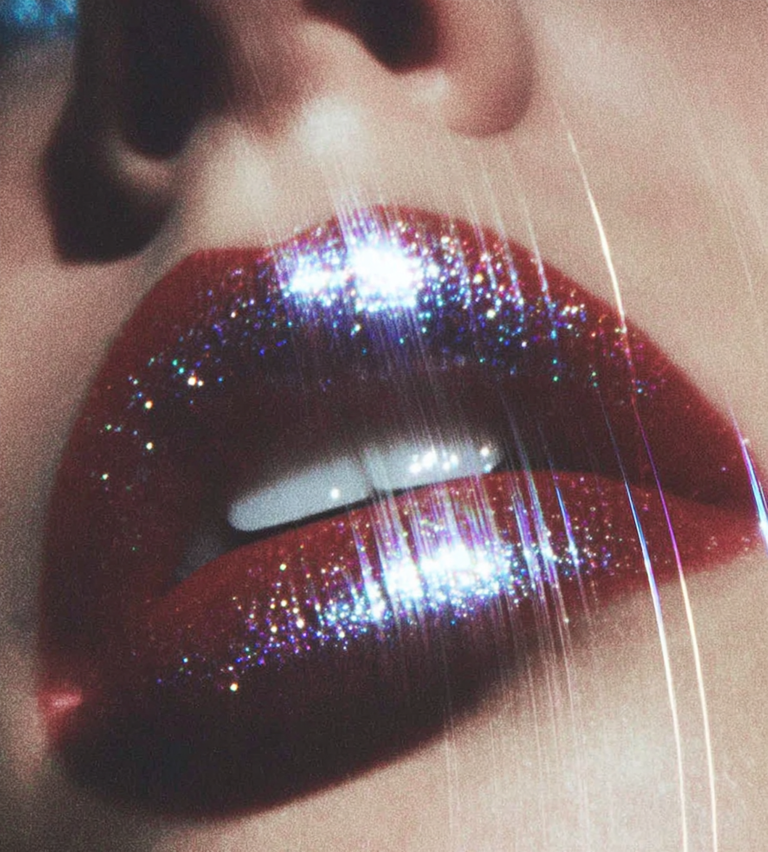 Close-up of glittery red lips with a glossy finish, reflecting light in vibrant colors, creating a dazzling and artistic effect.