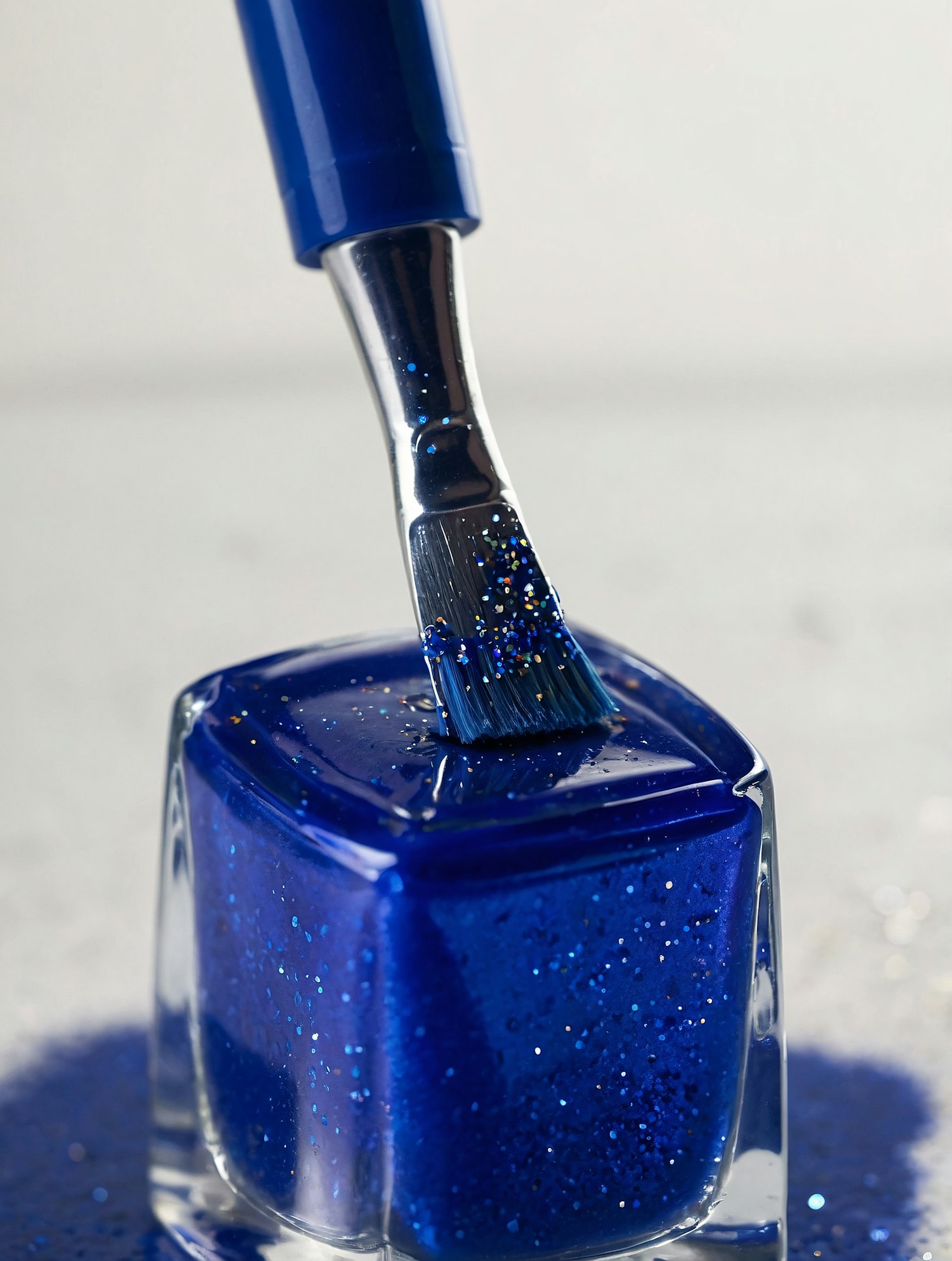 Close-up of a glittery blue nail polish bottle with a brush resting on the rim, showcasing its vibrant color and shimmer.