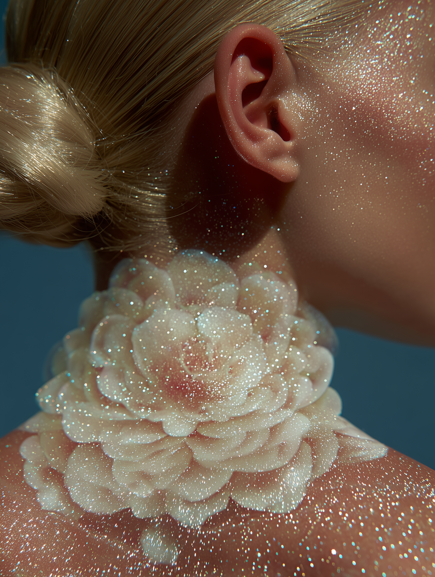 Close-up of a glittery floral body art design on a person's neck, with blonde hair in a bun and a soft blue background.