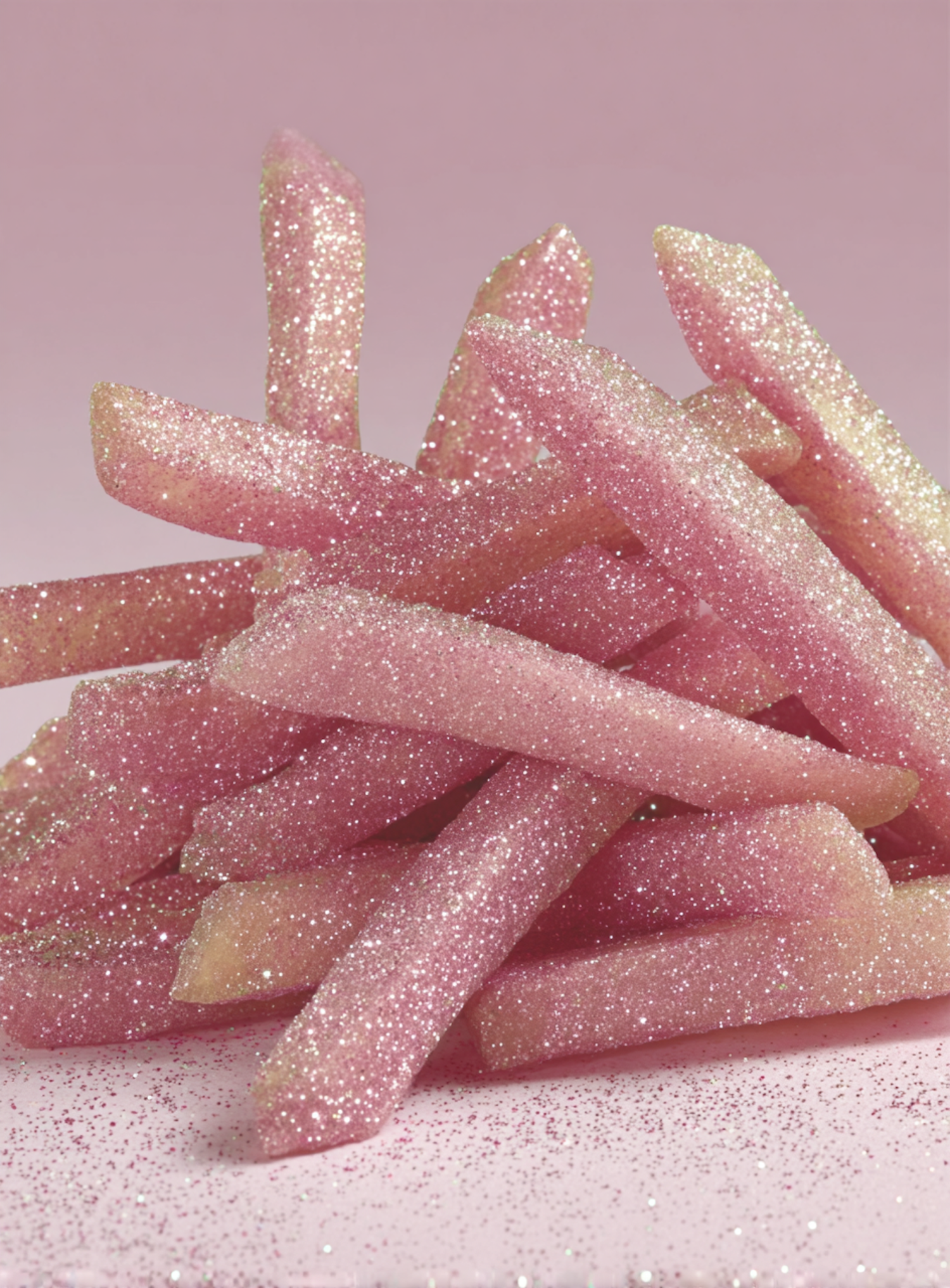 A pile of glitter-covered objects resembling French fries, sparkling against a soft pink background, creating a whimsical aesthetic.