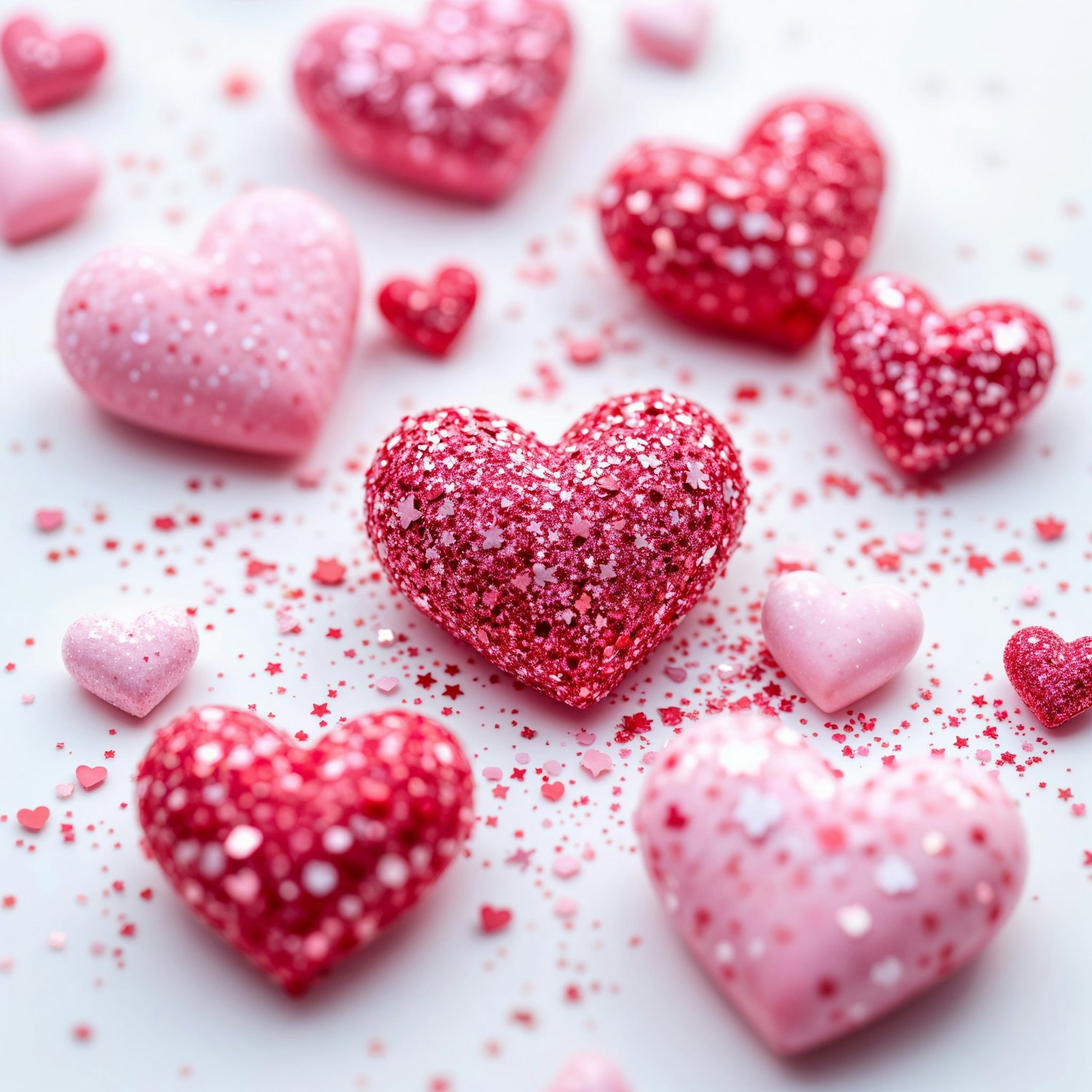 Glittery red and pink heart decorations with star-shaped glitter on a white background, creating a festive and romantic vibe.