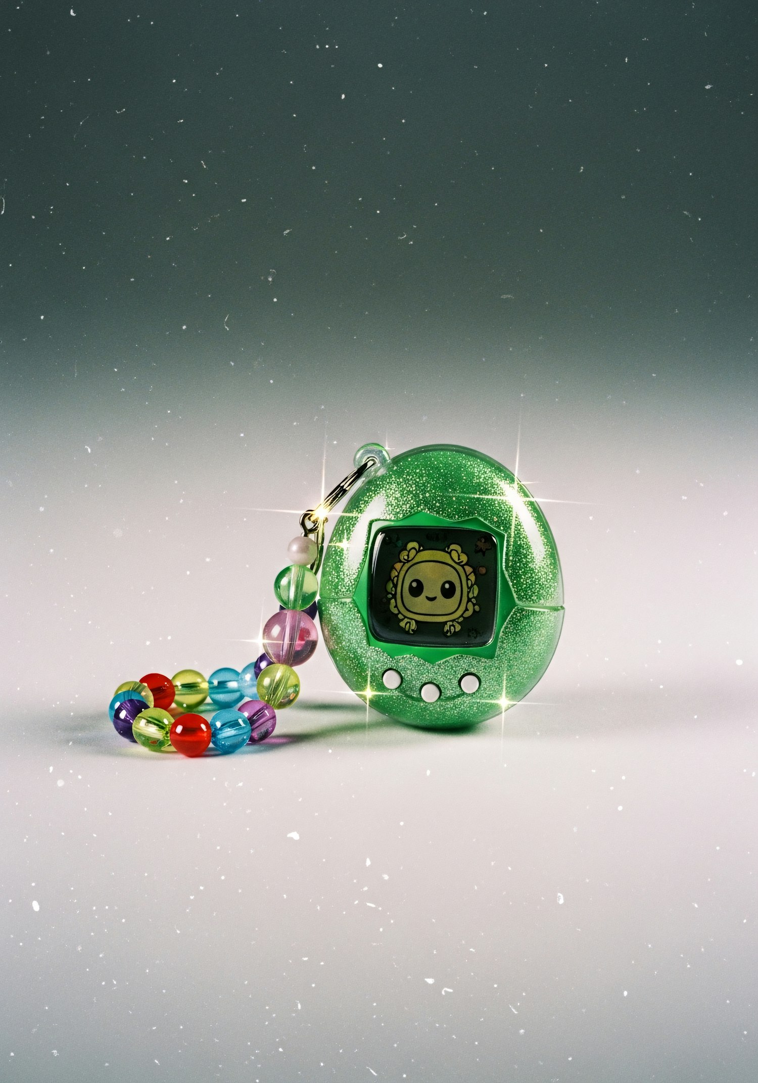 A glittery green virtual pet device with a colorful beaded chain, set against a sparkling gradient background.