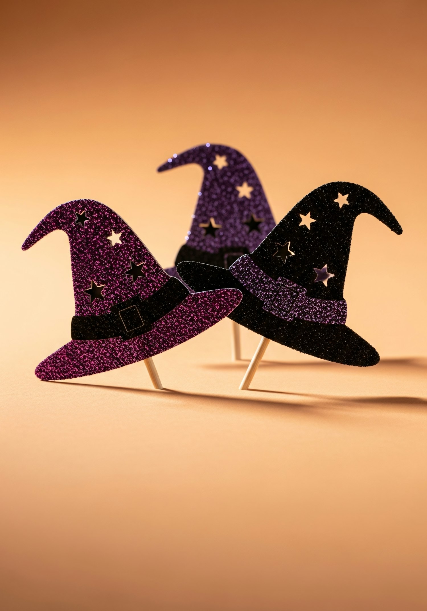 Three glittery witch hats in purple and black with star cutouts and buckles, set against a warm orange background.