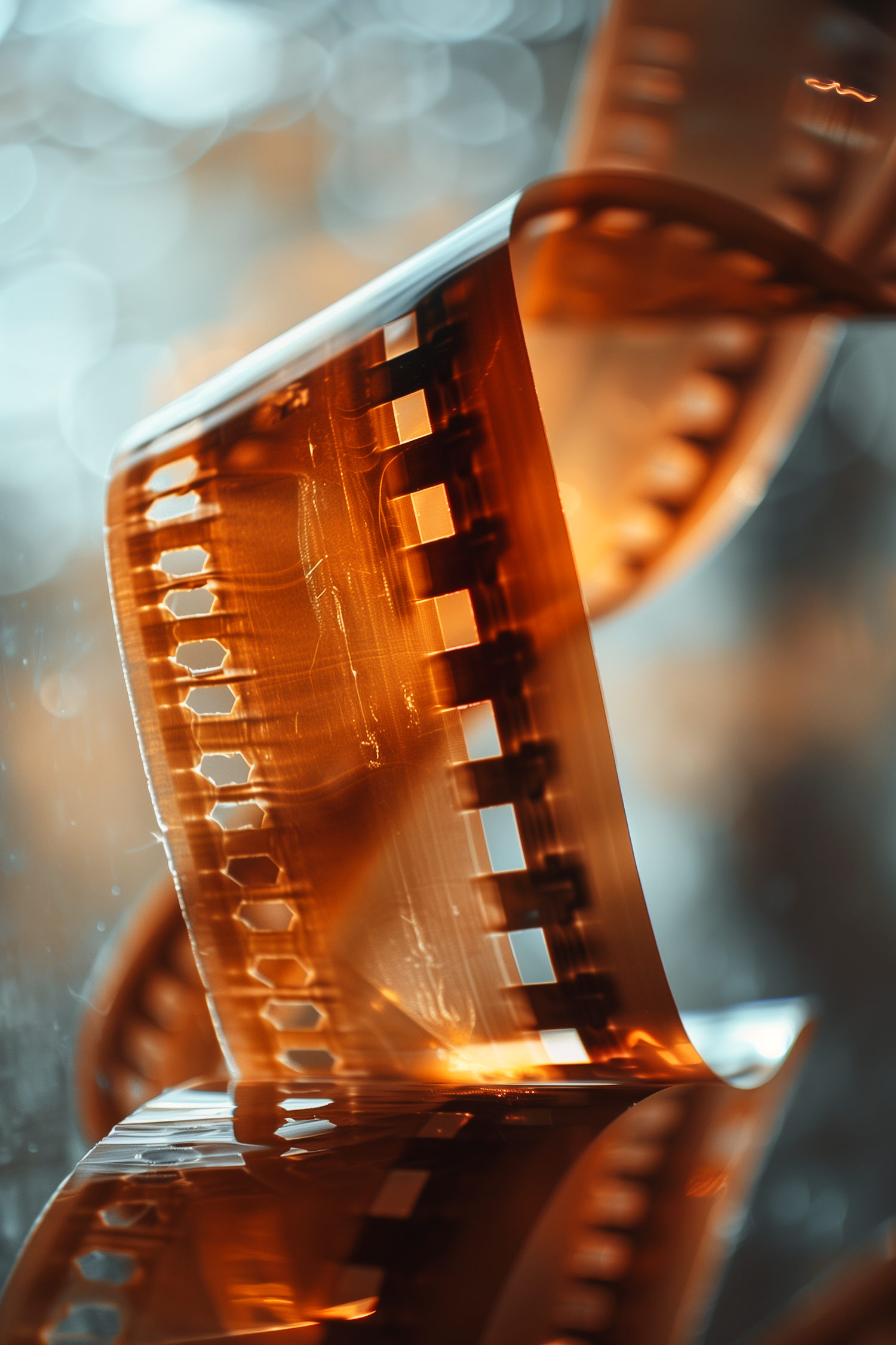 Close-up of a curled photographic film strip with perforated edges, reflecting light. Blurred bokeh background in blue and orange hues.