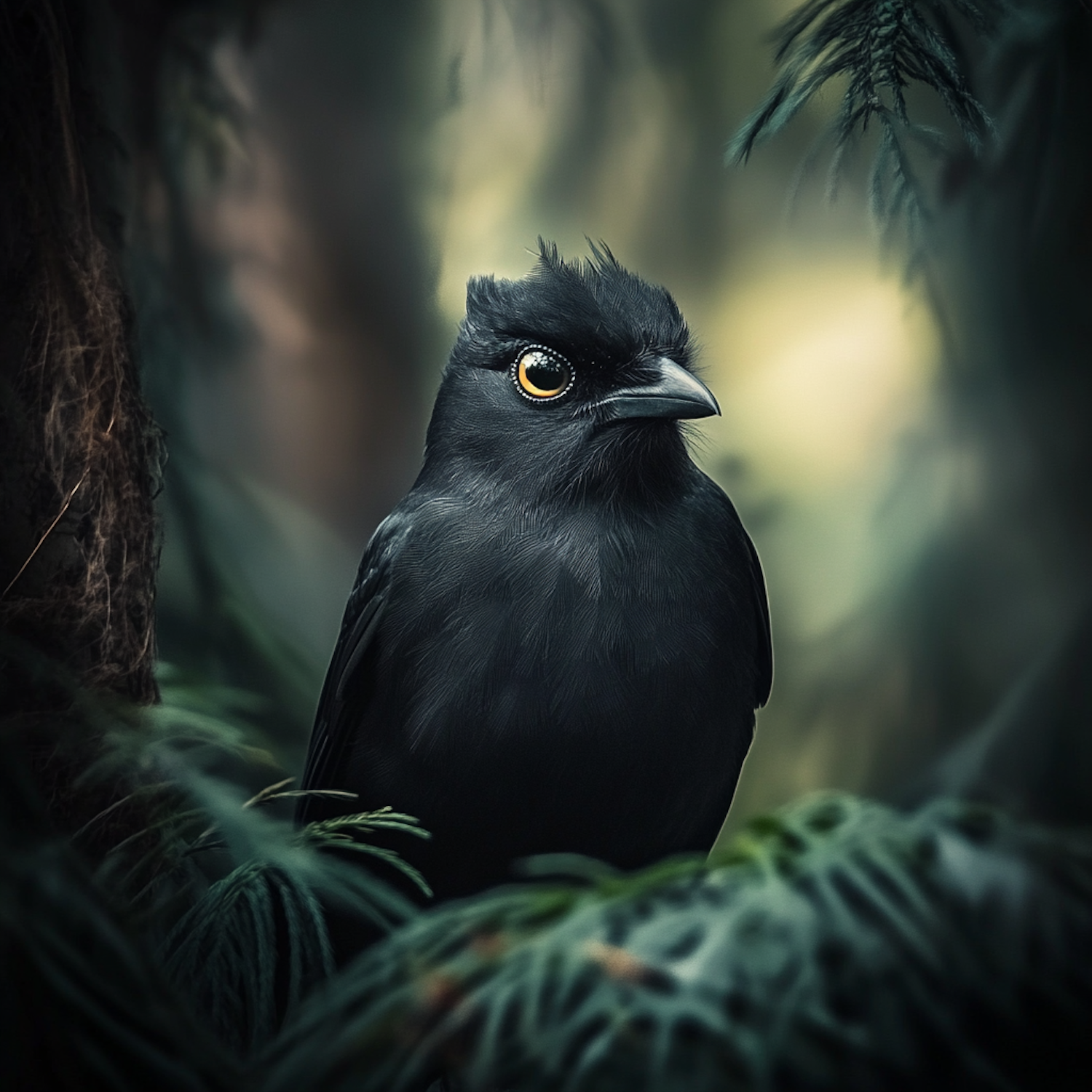 A glossy black bird with vivid eyes perched among lush green foliage, creating a serene and natural atmosphere.