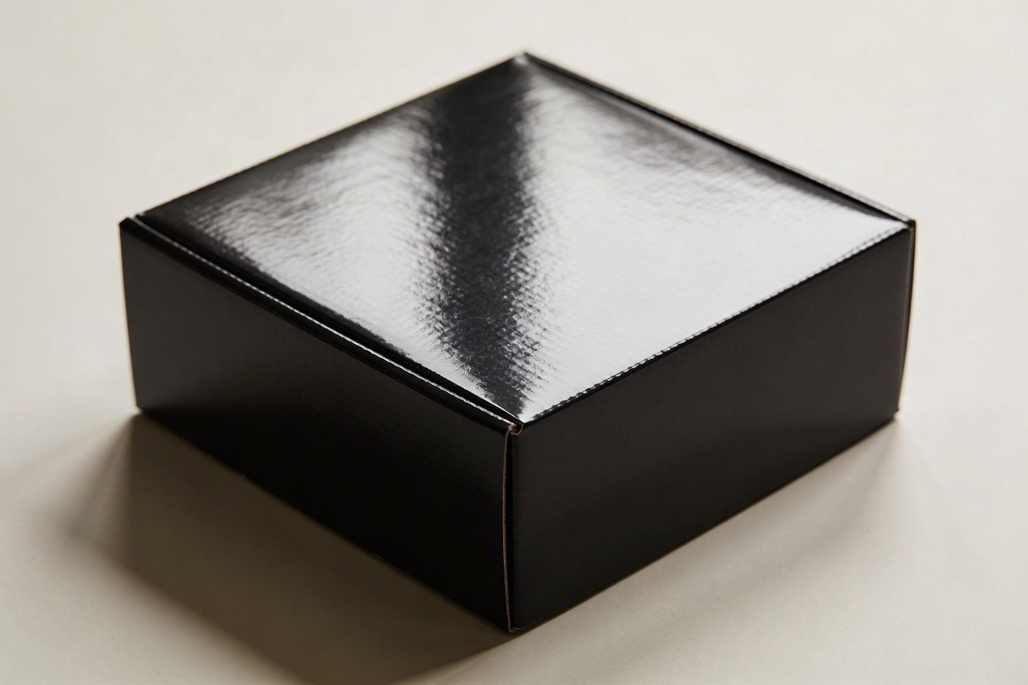 A glossy black box with clean edges and a reflective surface, perfect for premium packaging, set against a neutral background.