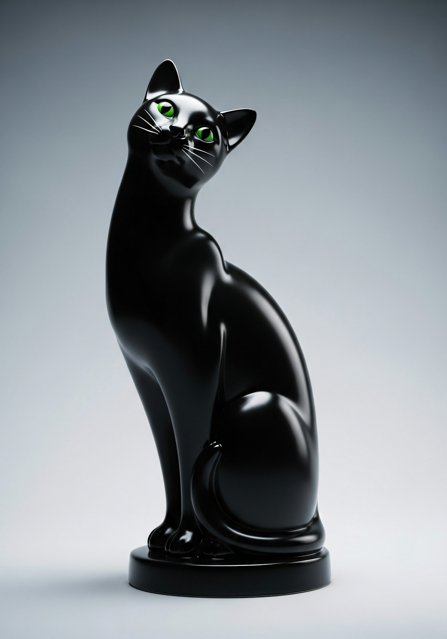 A glossy black cat figurine with striking green eyes, sitting elegantly on a round base against a light gray background.