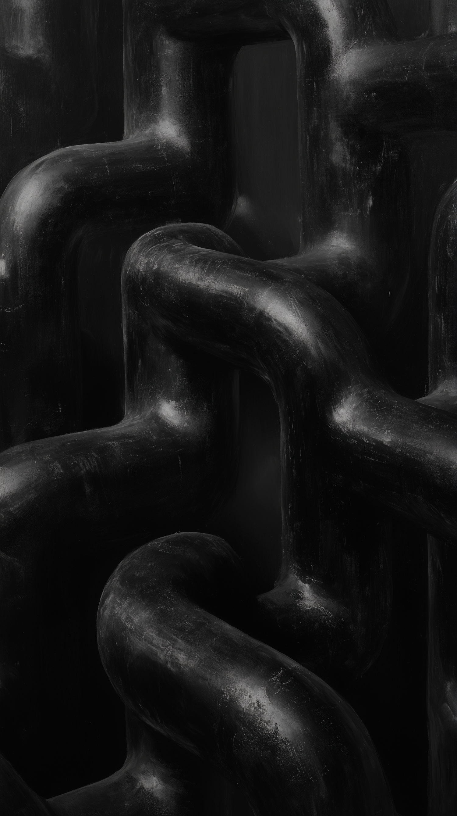 Glossy black pipes intertwine in a complex, abstract pattern with smooth curves and reflective surfaces against a dark background.