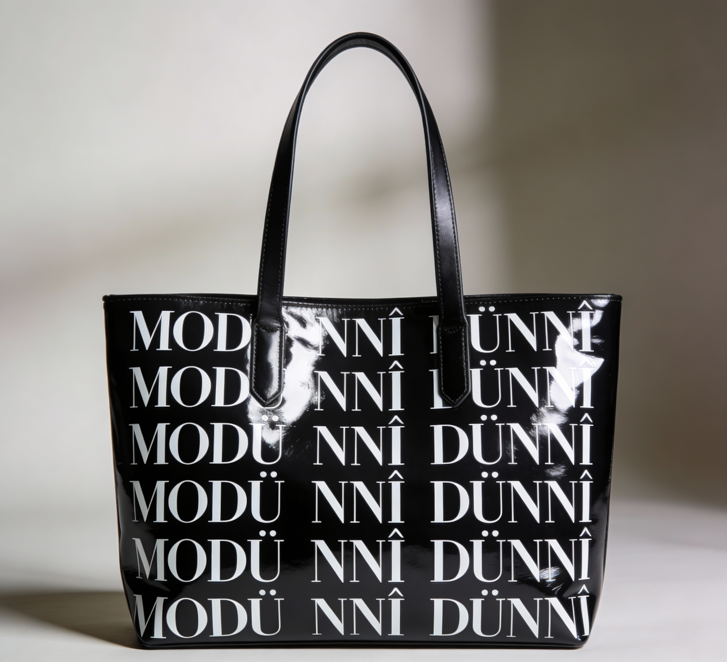 Create a high-fashion tote bag made of black leather with a reflective finish. The surface features a bold, all-over print of the word “MODÙNNÌ” in uppercase serif font, inspired by a hand-drawn sketch. The print is arranged in a grid-like layout with alternating orientations and staggered breaks such as “MODÙ”, “NNÌ”, and “DÙNNÌ” to add rhythm and texture. The typography is printed in matte white, sharply contrasting against the glossy black background. The bag should appear structured and elegant, photographed against a neutral backdrop to emphasize its material and graphic design.