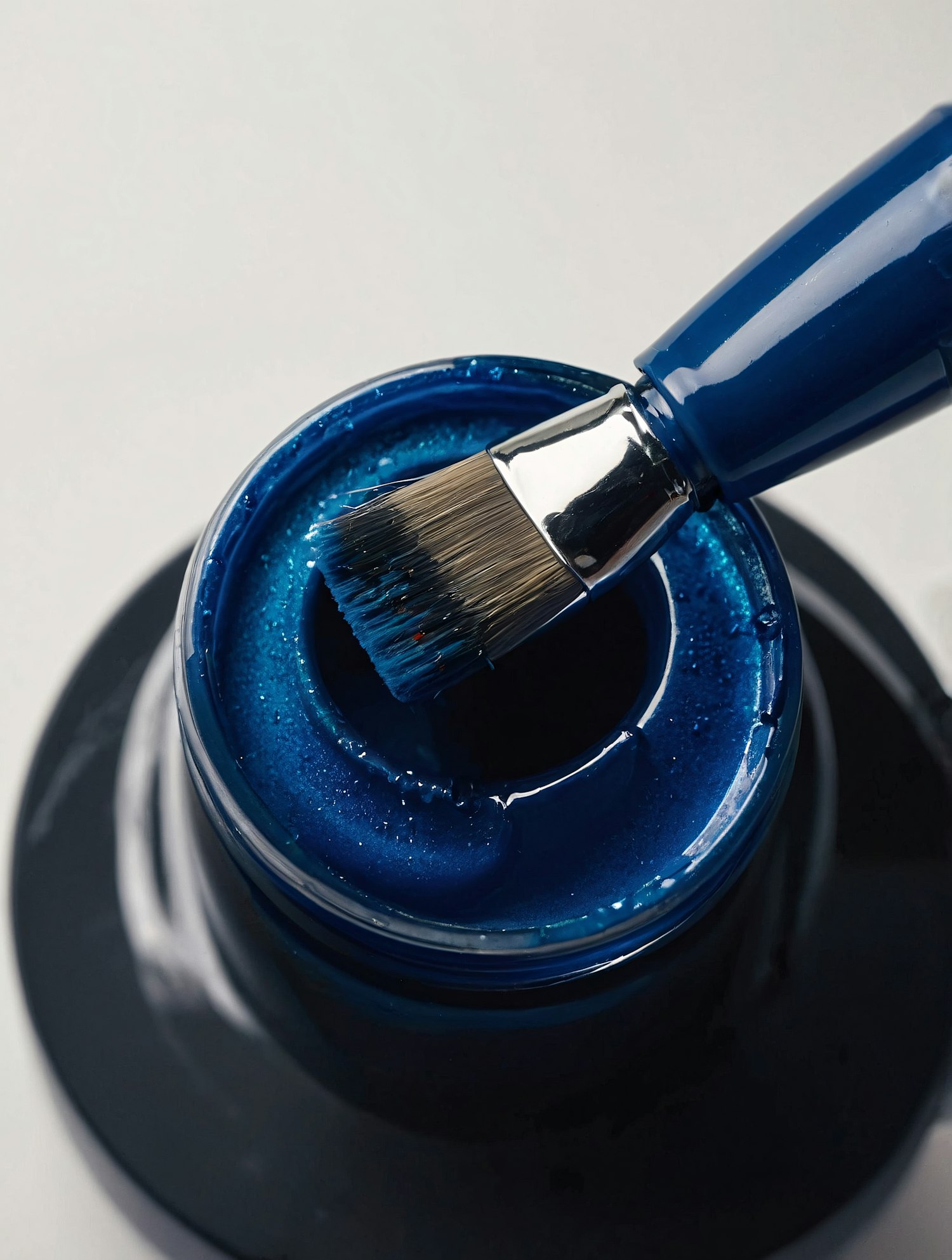 Close-up of a glossy blue gel with a matching brush dipped in, showcasing its smooth texture and vibrant color.