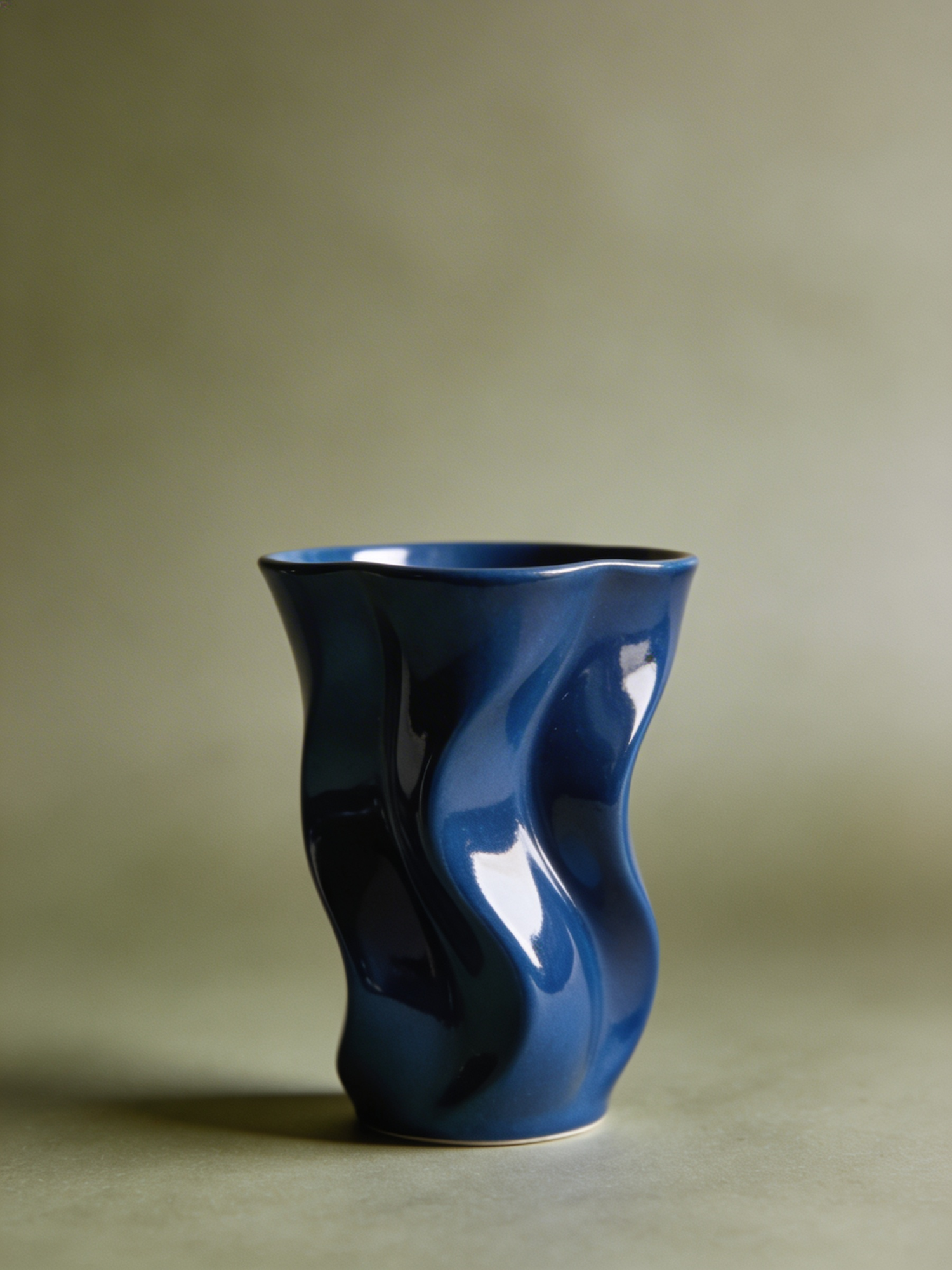 A glossy sculptural cup in deep blue, centered on a muted backdrop, soft studio lighting, no text.