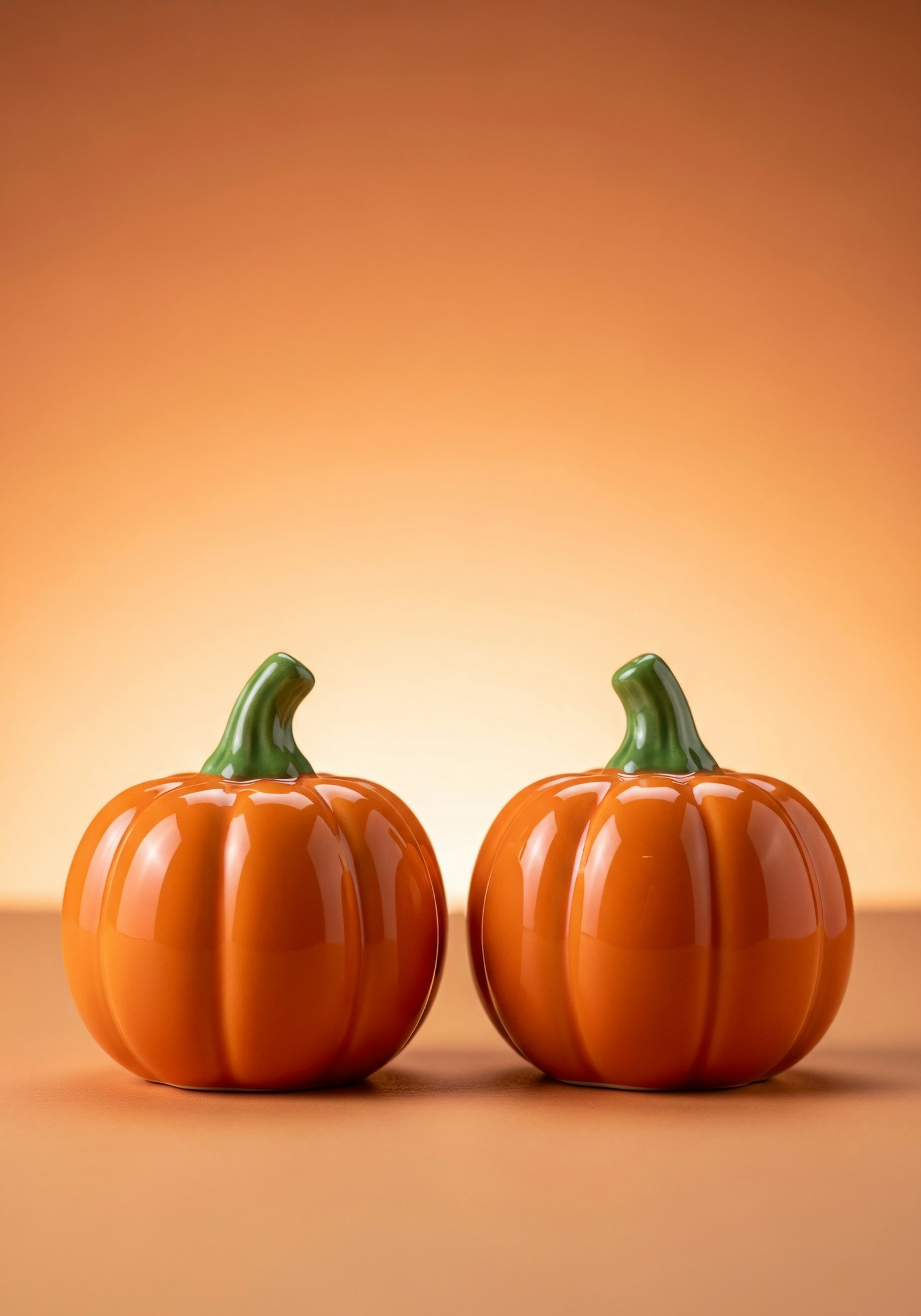 Two glossy ceramic pumpkins with green stems on a warm orange gradient background, perfect for autumn or Halloween decor.
