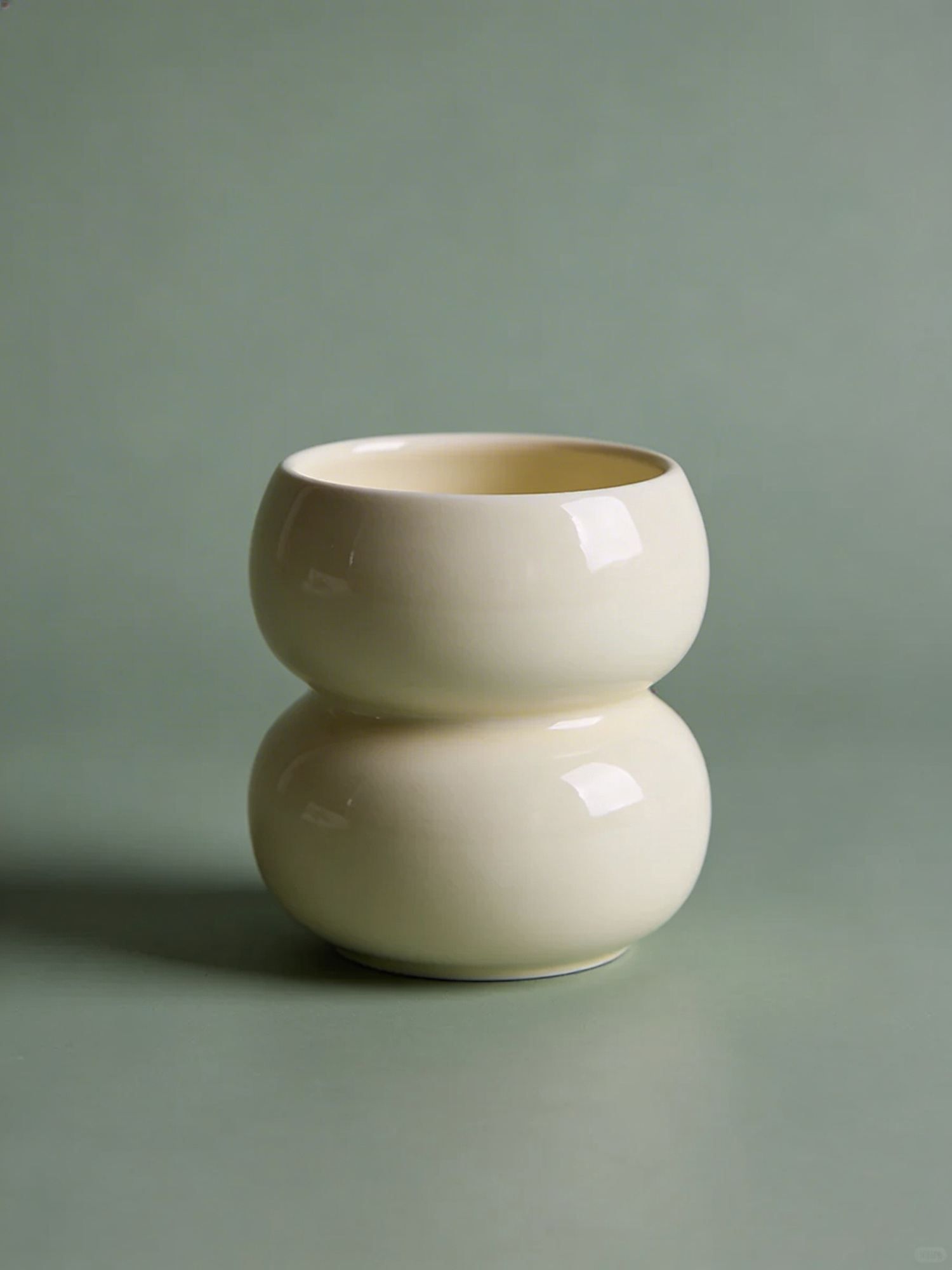 A modern cream-colored ceramic vase with a double-bulbous design, set against a muted green background for a minimalist aesthetic.