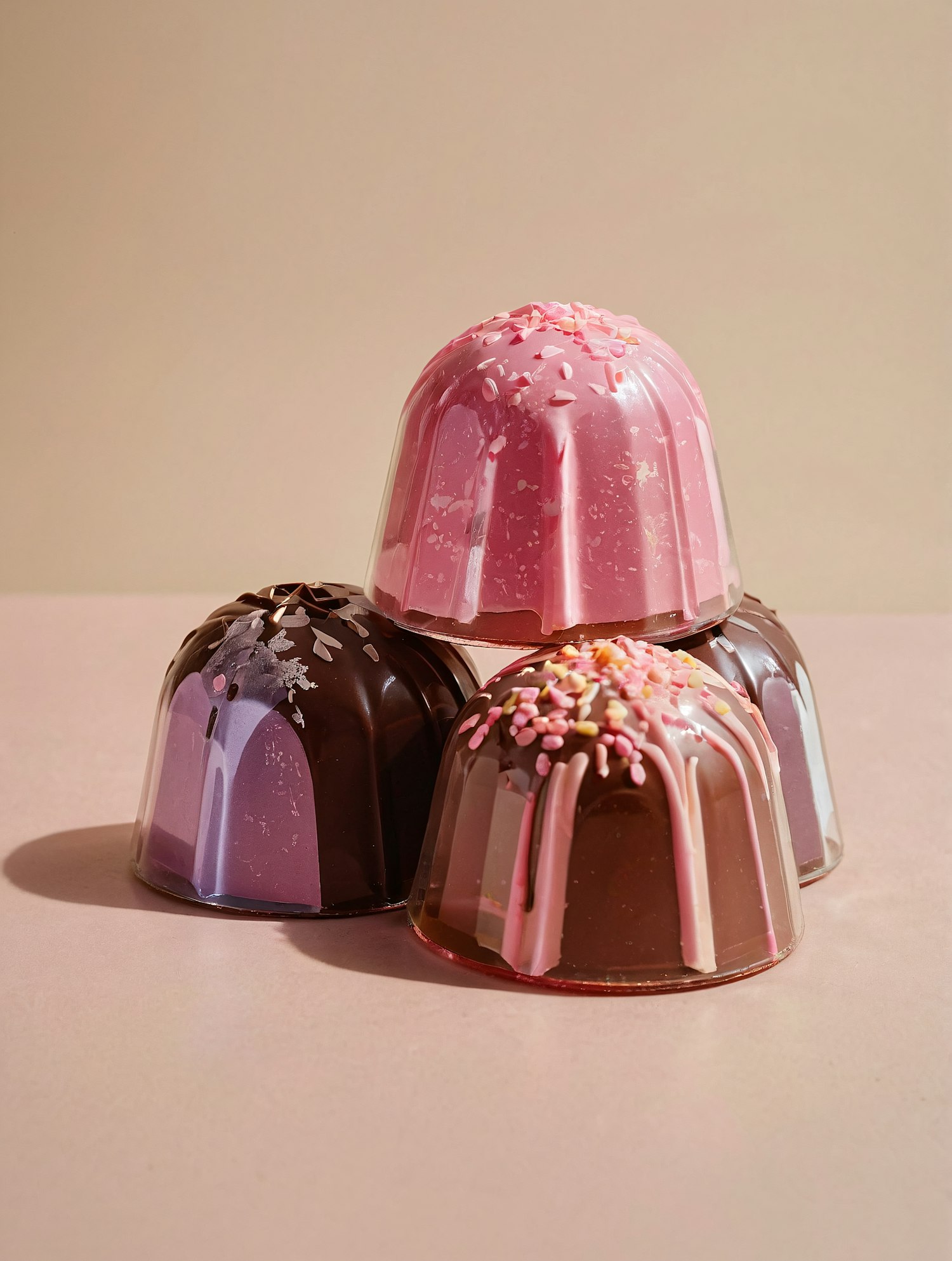Stacked glossy dome-shaped desserts in pink, chocolate, and purple hues, topped with sprinkles and drizzles, on a pastel background.