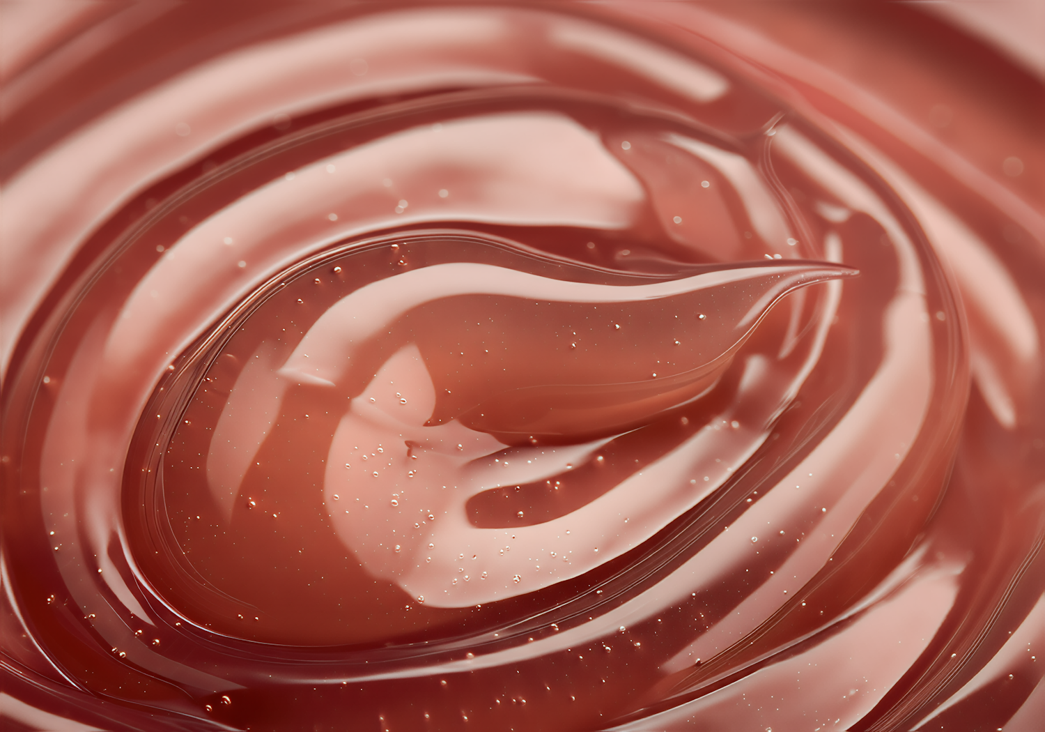 Close-up of a glossy, reddish-brown gel-like substance with swirling textures and small air bubbles, illuminated to highlight its smooth surface.
