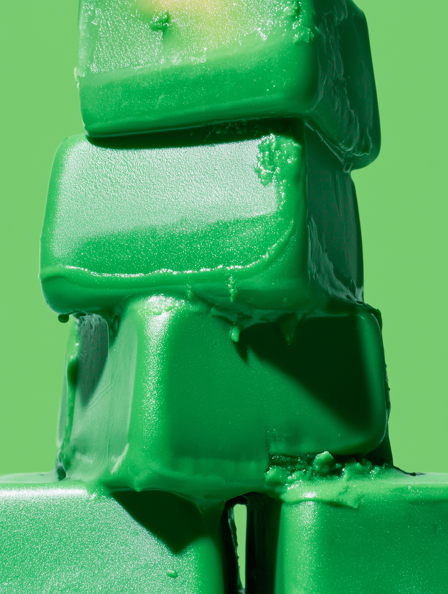 Close-up of glossy green blocks stacked together, with a smooth and shiny texture, set against a matching green background.