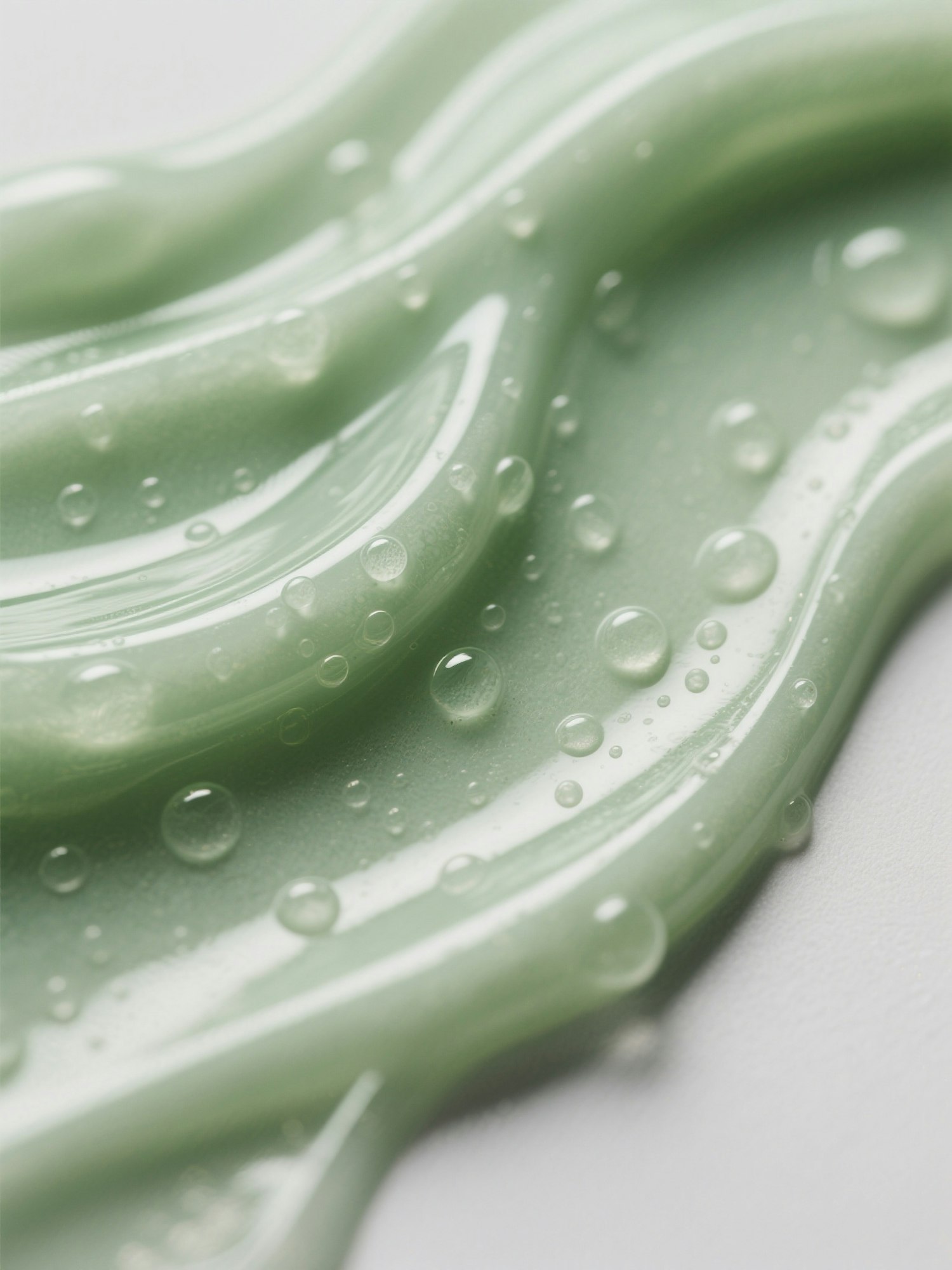 macro shot of a translucent skincare gel or serum with a smooth flowing texture and soft bubbles, in a natural sage green color — abstract composition, warm lighting, realistic photography, minimal and elegant, perfect for background use in skincare branding — no text or logo, clean and calm atmosphere