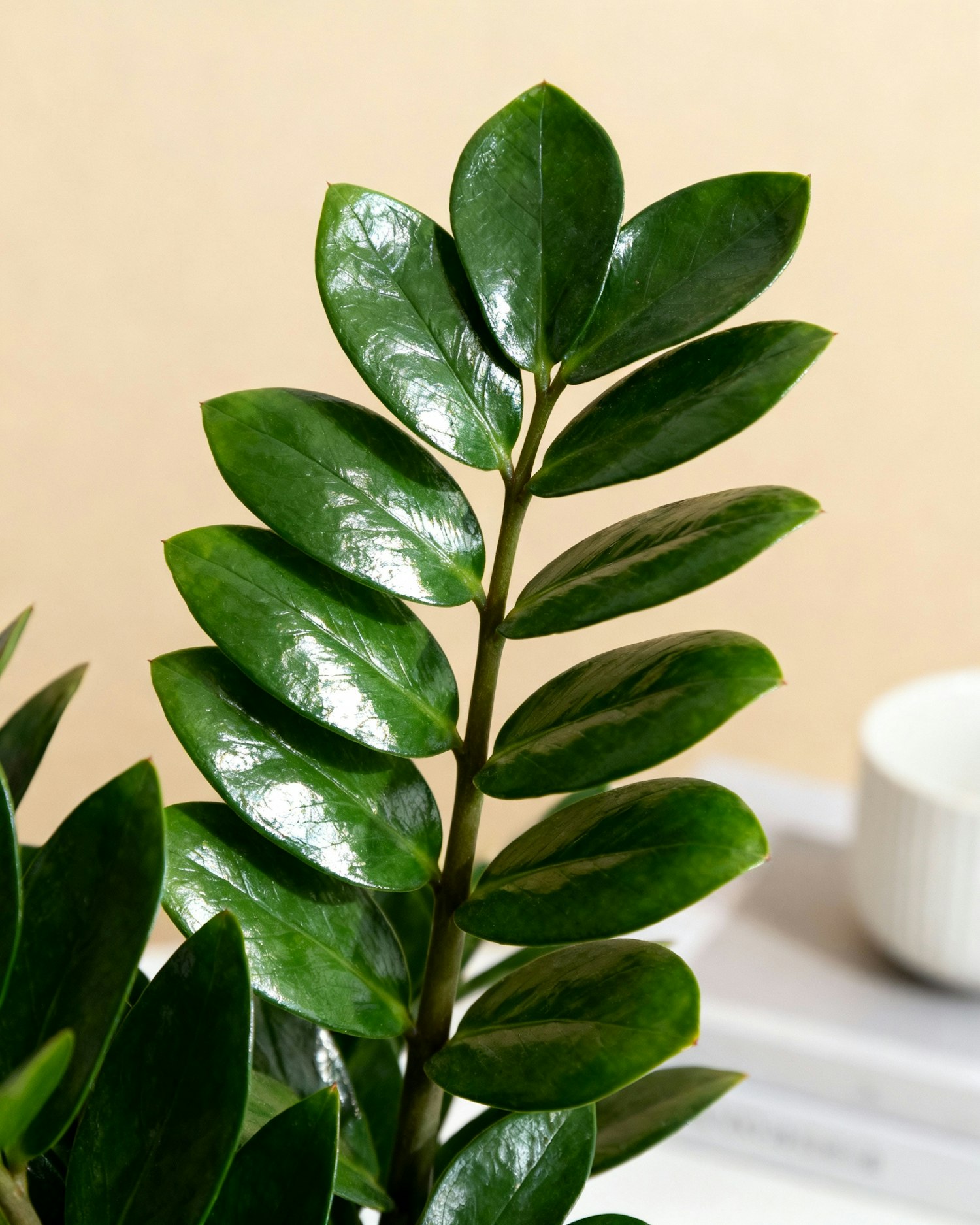 bright soft studio lighting, clean professional studio setup, smooth light beige backdrop with a matte finish, even diffused shadows, ultra realistic plant details, matte ceramic surfaces, refined composition, no people. close-up of a zz plant, glossy oval leaves in layered rows, bright soft highlights, cropped composition focusing on the upper half of the plant