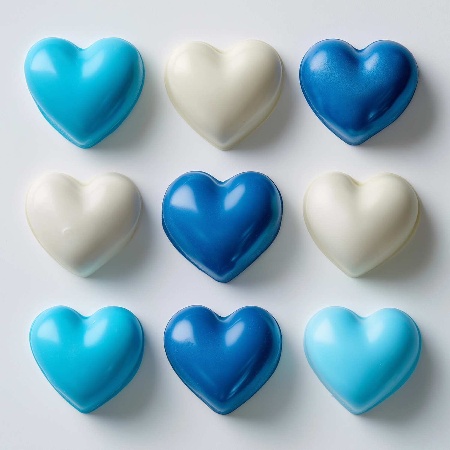 Glossy heart-shaped objects in blue and white shades arranged in a neat grid on a white background. Perfect for decor or gifting ideas.