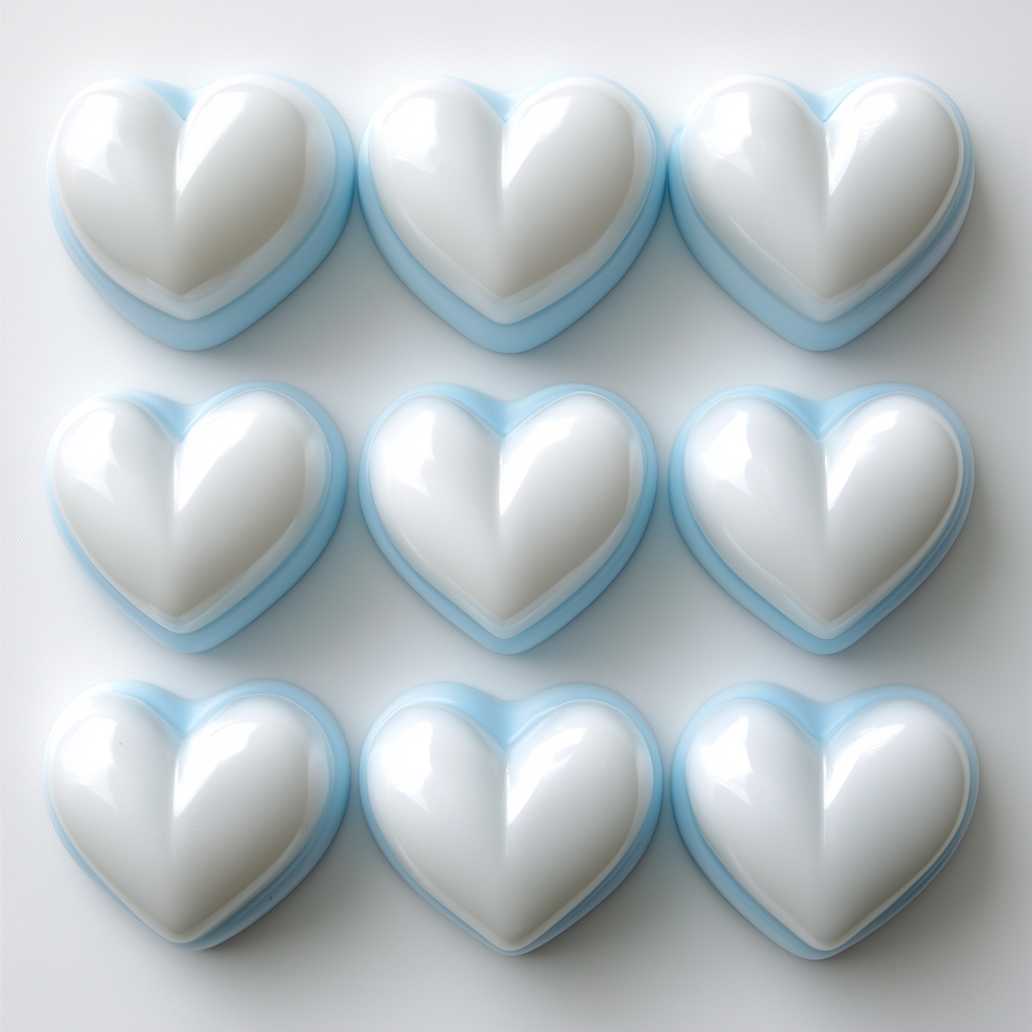 A grid of glossy white and blue heart-shaped objects on a clean white background, arranged in a neat 3x3 pattern.
