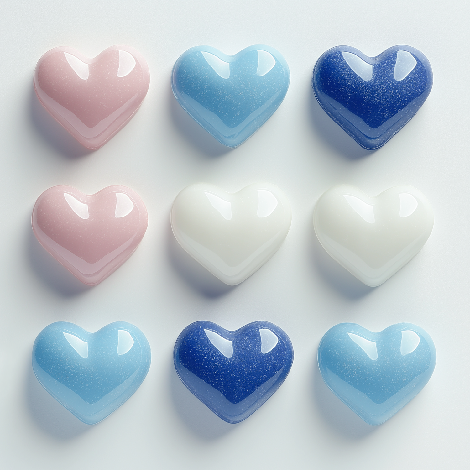 Glossy heart-shaped objects in pastel pink, blue, and white arranged in a neat grid on a clean white background.