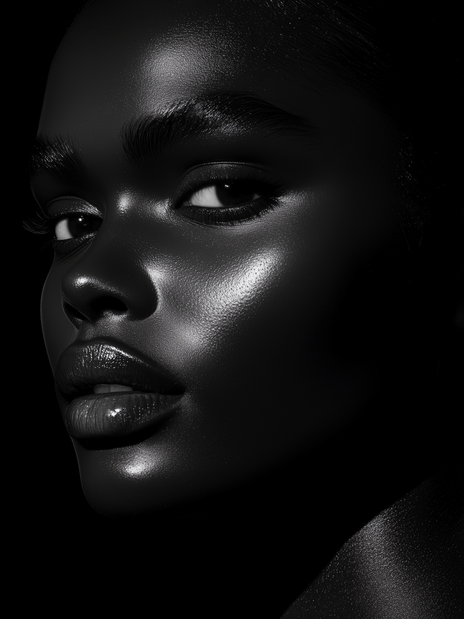 Close-up portrait of a Black woman with glossy skin, intense eyes, and full lips, set against a black background.