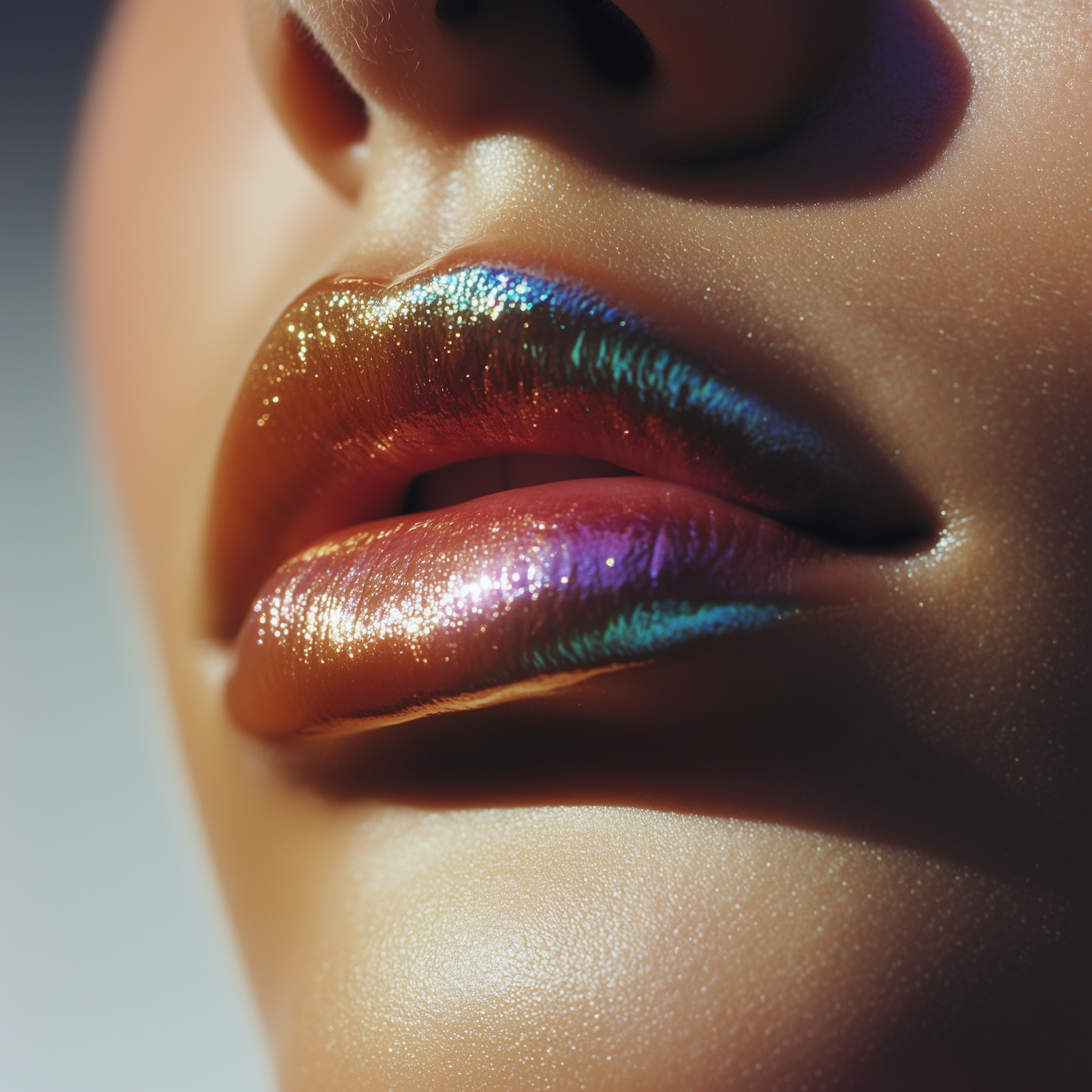 Close-up of glossy, iridescent lips reflecting gold, purple, and blue tones, with smooth skin and warm lighting for a striking look.