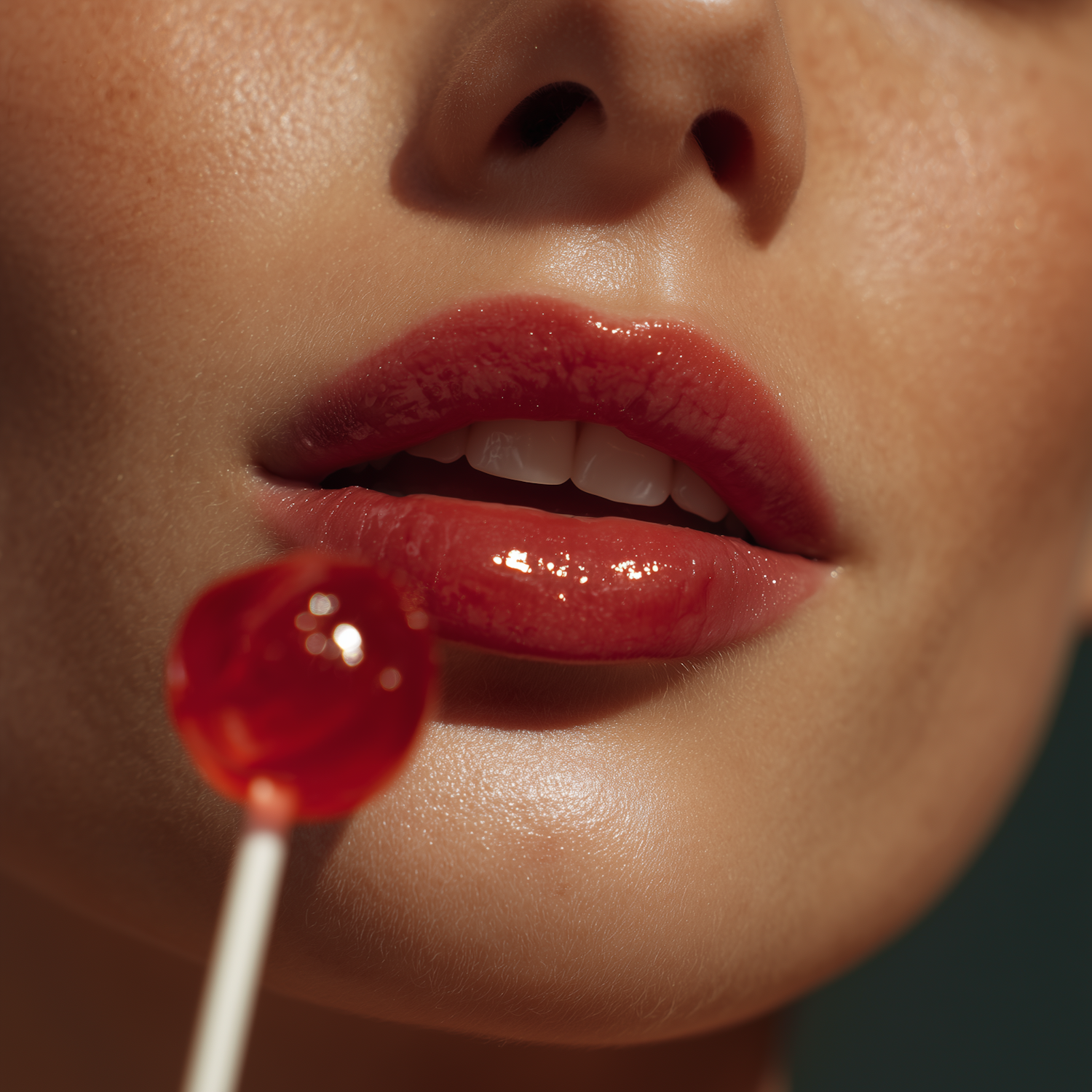 Close-up of glossy red lips with a red lollipop, showcasing vibrant colors and smooth textures in a well-lit composition.