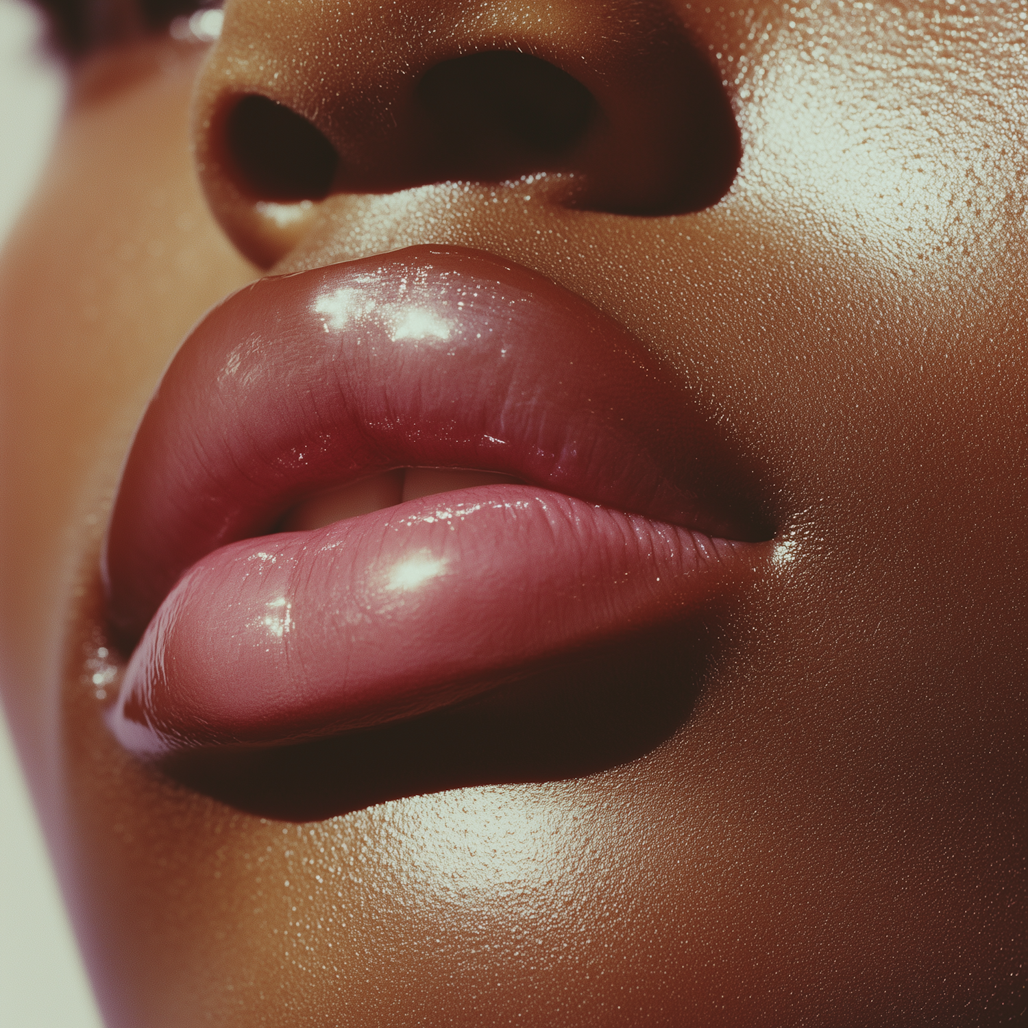 Close-up of glossy pink lips on radiant deep brown skin, highlighting smooth texture and luminous shine. Perfect for beauty inspiration.