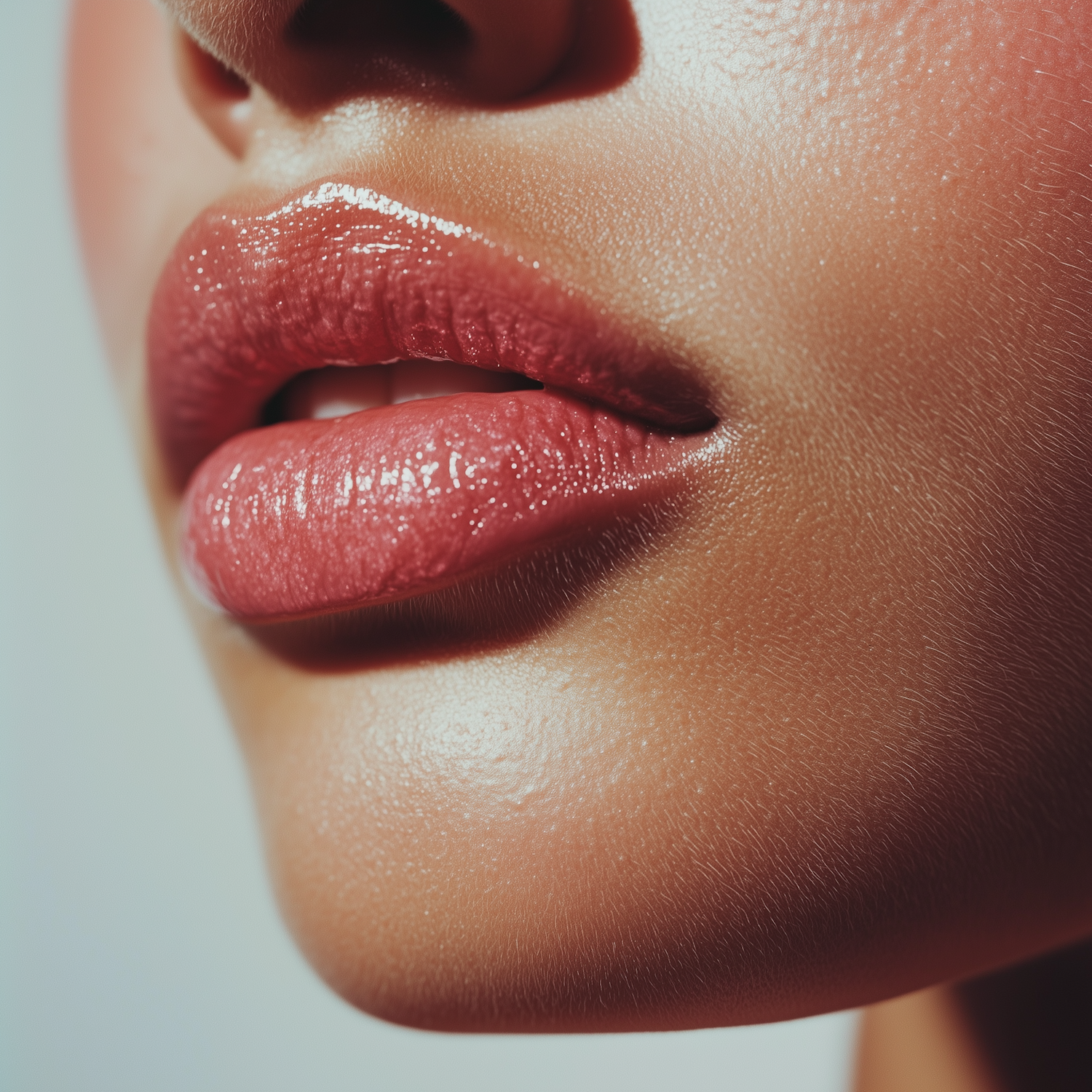 Close-up of glossy pink lips with smooth, glowing skin. Perfect for beauty or skincare inspiration.