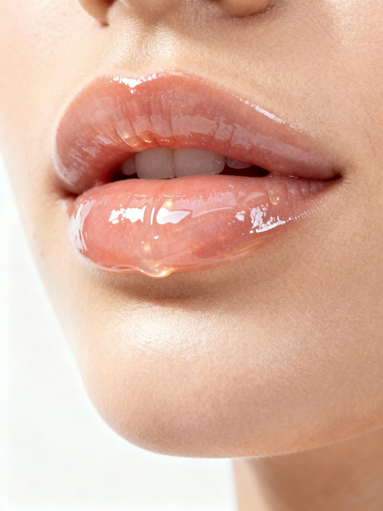 clean beauty campaign photography, minimalist white studio background, natural daylight with soft diffusion, high-end editorial lighting, focus on natural textures and radiant skin, no harsh shadows, aesthetic clean girl style, modern and feminine mood, inspired by Glossier and Summer Fridays campaigns, ultra-realistic, photographic rendering, professional studio shot — extreme close-up of female lips, glossy and luminous texture, transparent lip oil reflecting light, smooth natural skin around lips, focus on shine and hydration, macro beauty shot