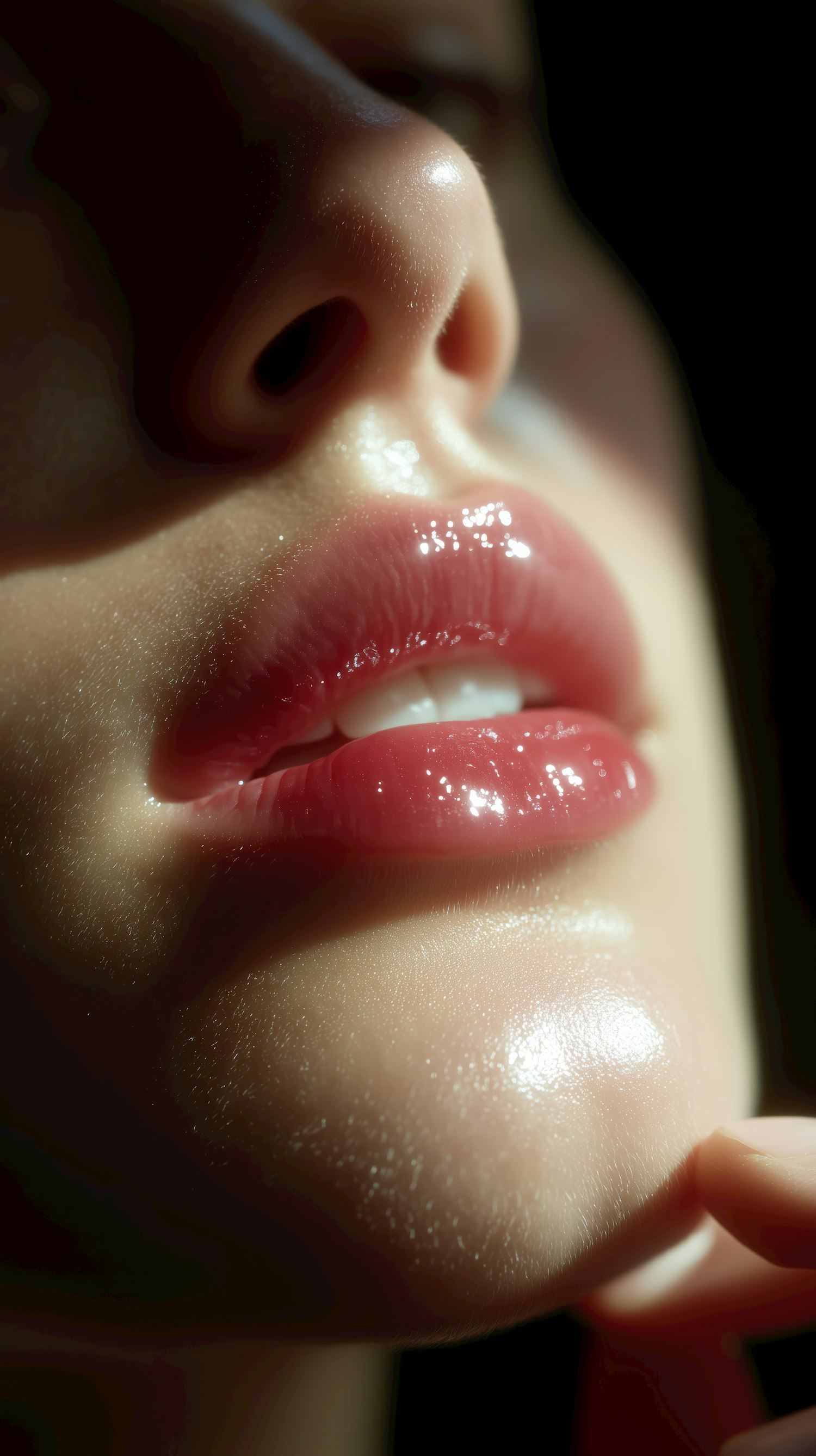 Close-up of glossy lips and glowing skin with dramatic lighting, highlighting texture and natural beauty. A finger gently touches the chin.