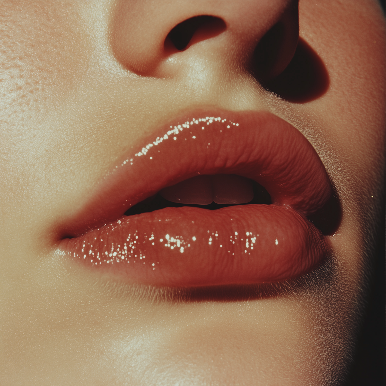 Close-up of glossy, hydrated lips with a warm tone and soft lighting, highlighting natural texture and shine.