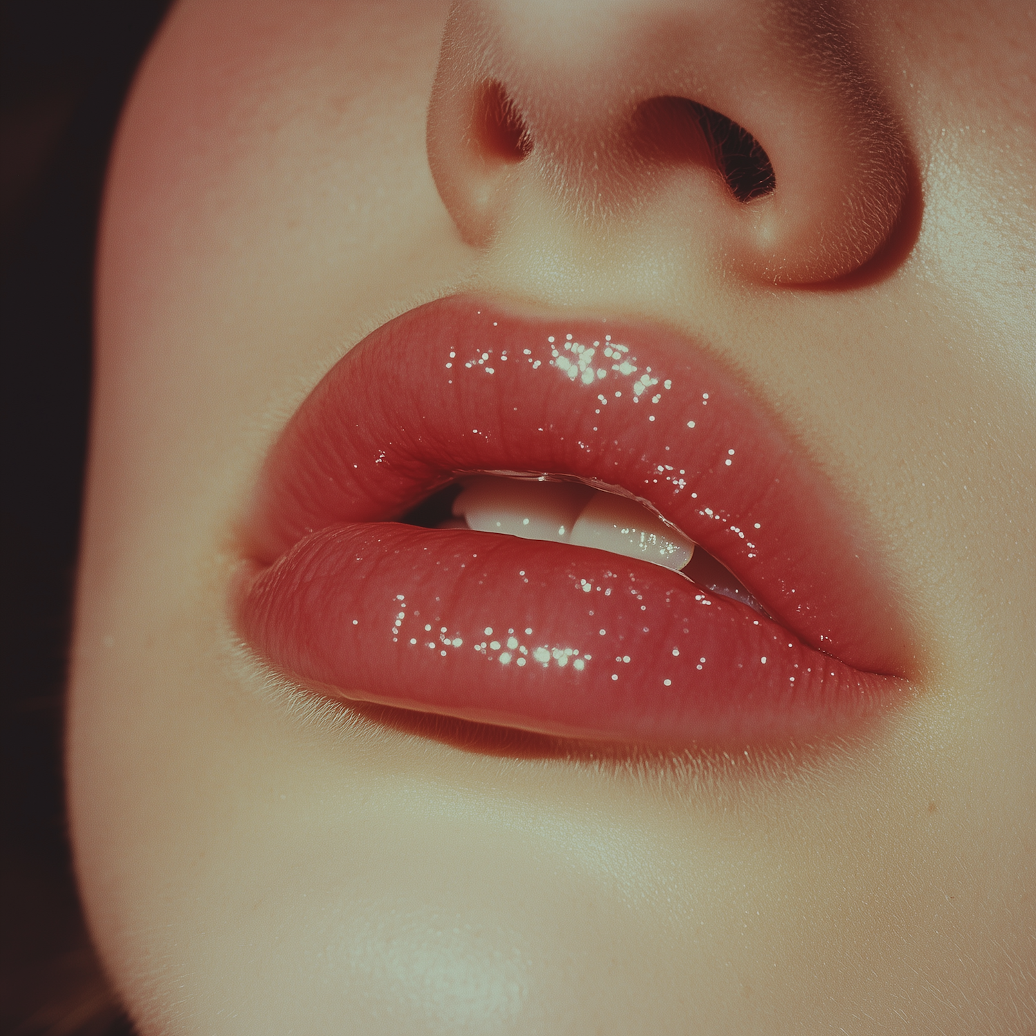 Close-up of glossy pinkish-red lips with smooth, fair skin and soft lighting, highlighting the vibrant and shiny texture.