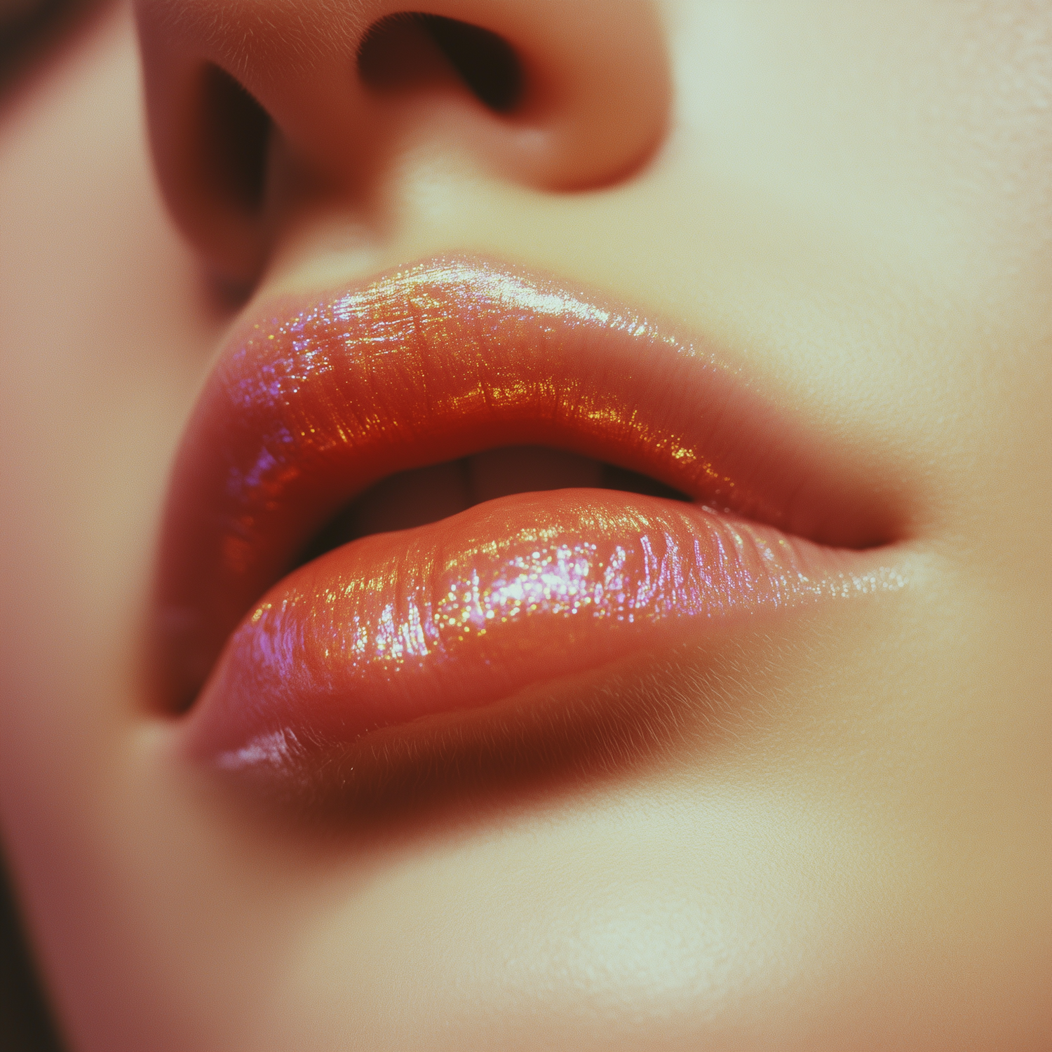 Close-up of glossy lips with vibrant orange and pink shimmer, slightly parted, reflecting light beautifully for a radiant look.