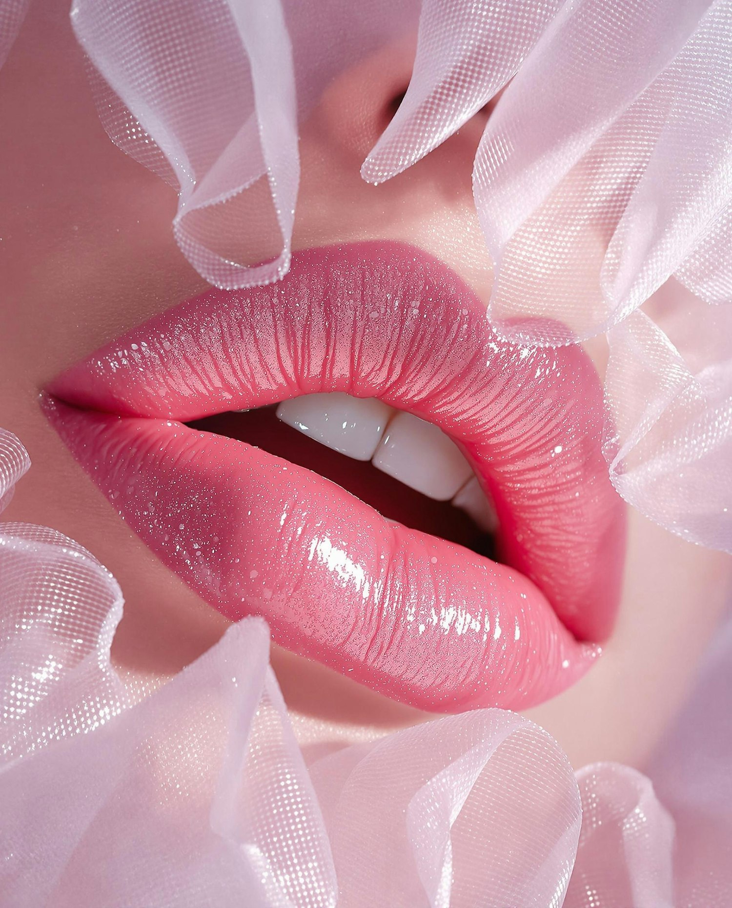 Extreme close-up of glossy pink lips surrounded by semi-transparent ruffled tulle, focus on lip texture and glistening finish, captured in sharp detail for a high-end beauty campaign feel.