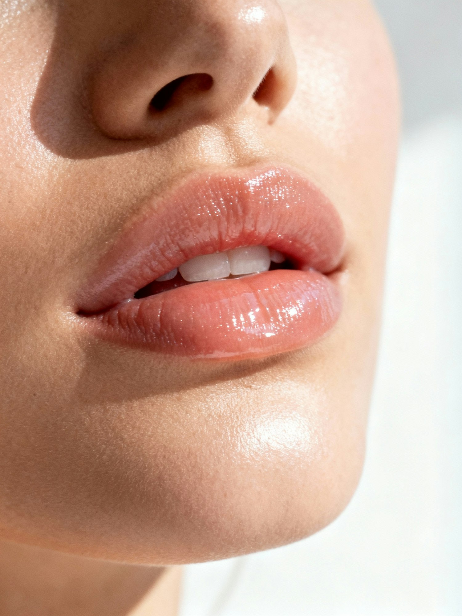 clean beauty campaign photography, minimalist white studio background, natural daylight with soft diffusion, high-end editorial lighting, focus on natural textures and radiant skin, no harsh shadows, aesthetic clean girl style, modern and feminine mood, inspired by Glossier and Summer Fridays campaigns, ultra-realistic, photographic rendering, professional studio shot — macro close-up of female lips with a soft natural gloss, hydrated and luminous finish, gentle reflections of light, warm skin tones, natural texture visible, elegant and sensual without exaggeration