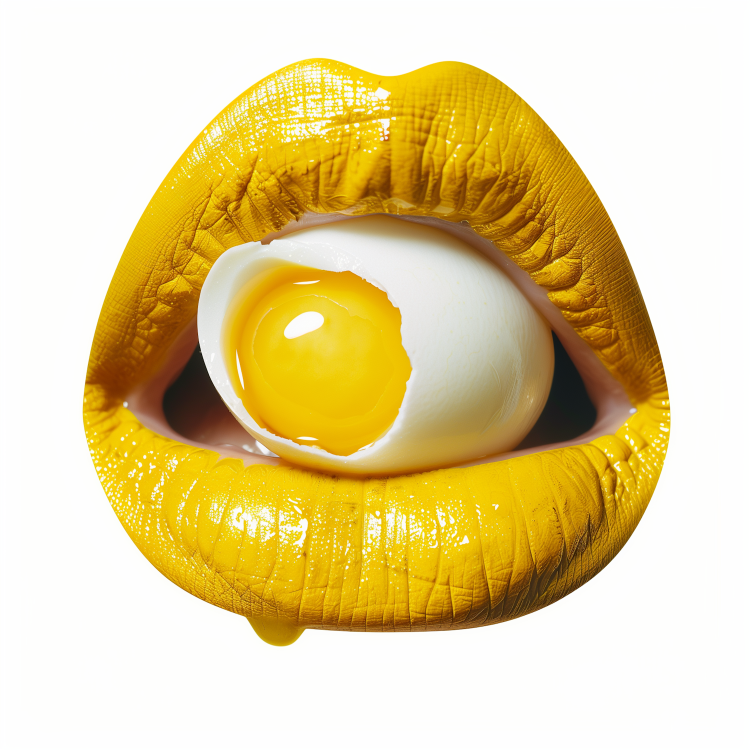 Glossy yellow-painted lips hold a cracked egg with a vibrant yolk, creating a bold and surreal pop-art-inspired visual.