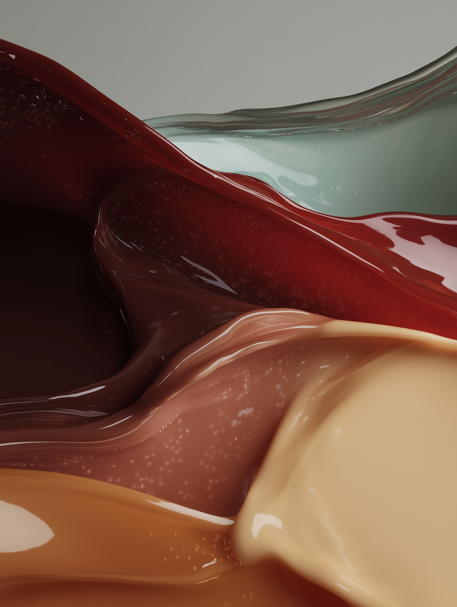 Abstract close-up of glossy, liquid-like textures in red, brown, caramel, and cream tones, blending seamlessly with a muted gray background.