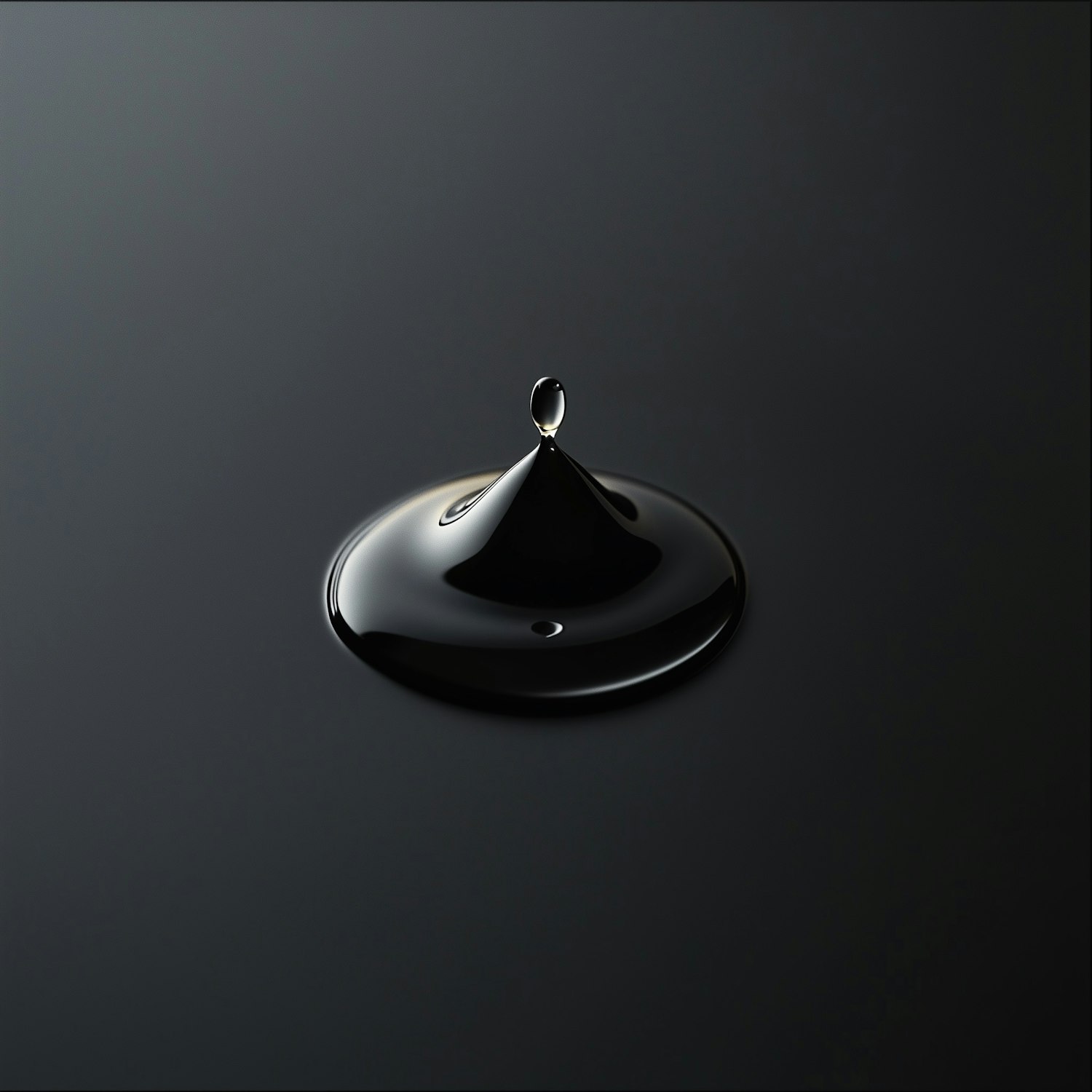 A glossy droplet of liquid, likely oil, captured mid-motion on a dark reflective surface, creating a sleek and minimalistic visual.