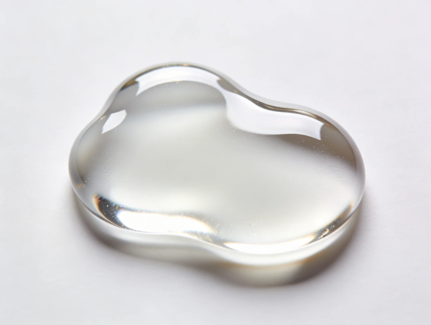 A clear liquid droplet on a white surface, showcasing its glossy texture and light reflections in a close-up view.
